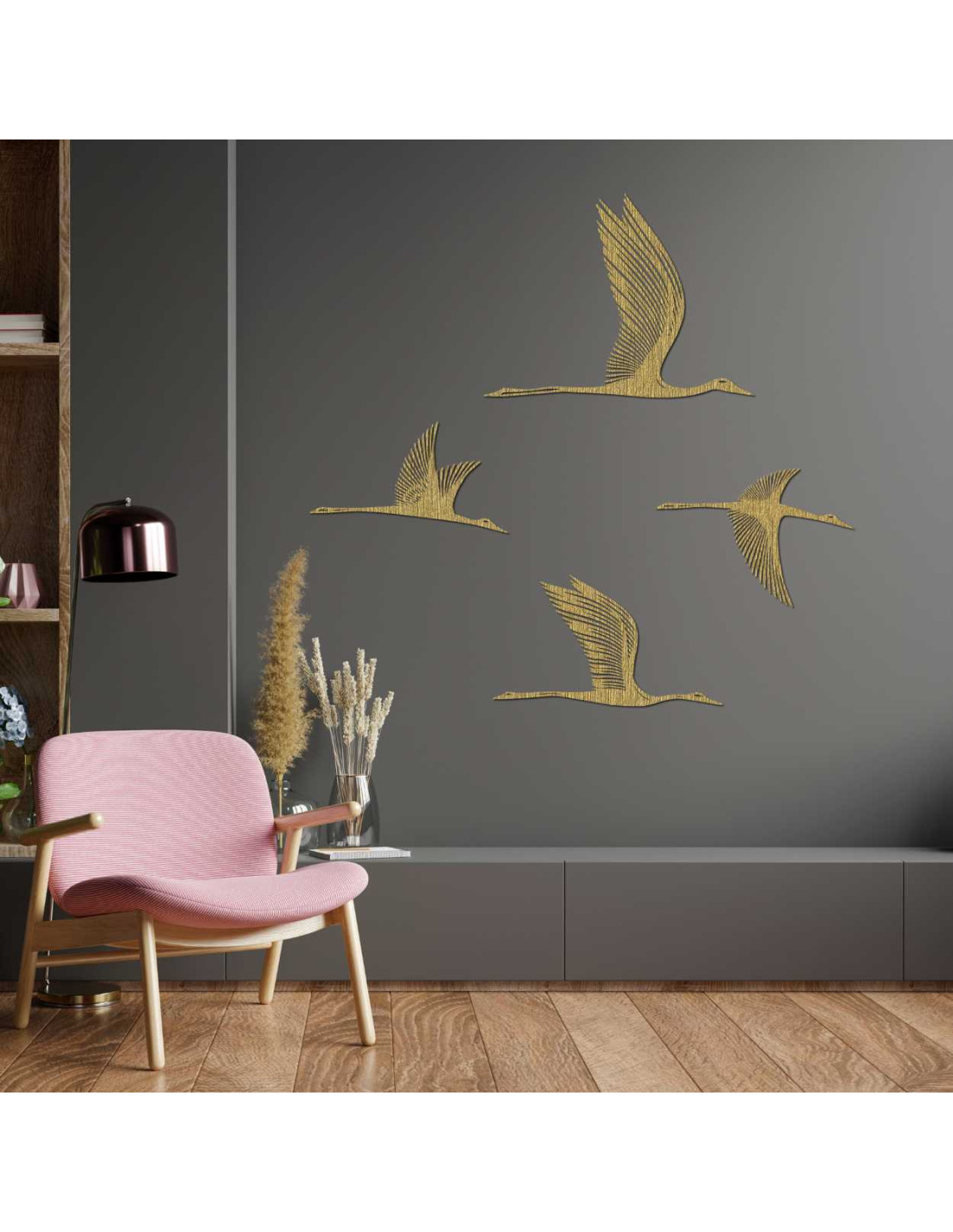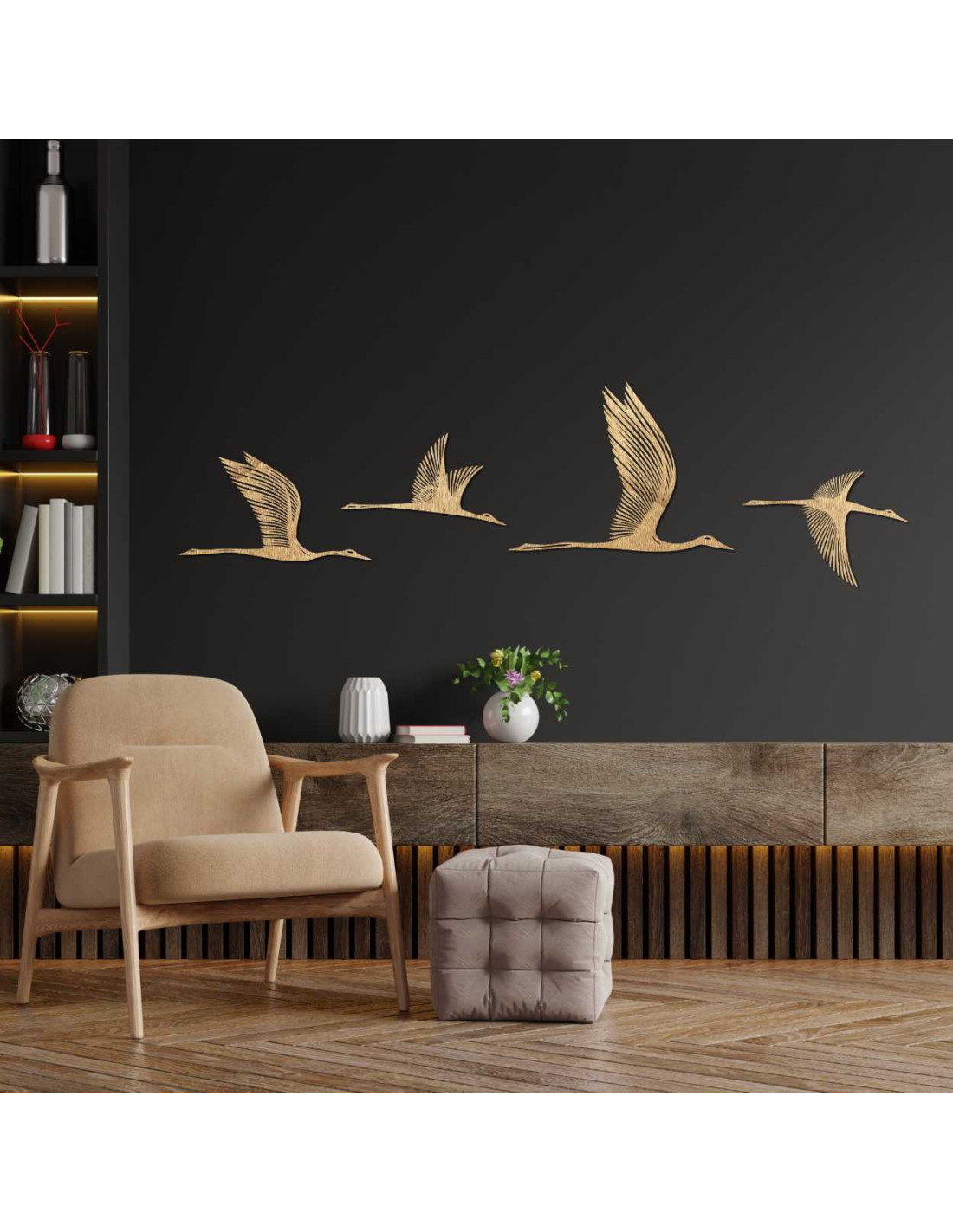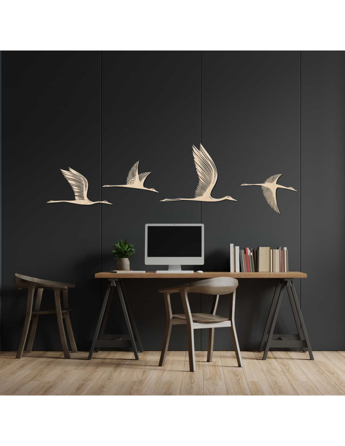 Drewniana dekoracja ścienna z czterema latającymi ptakami w stylu minimalistycznym