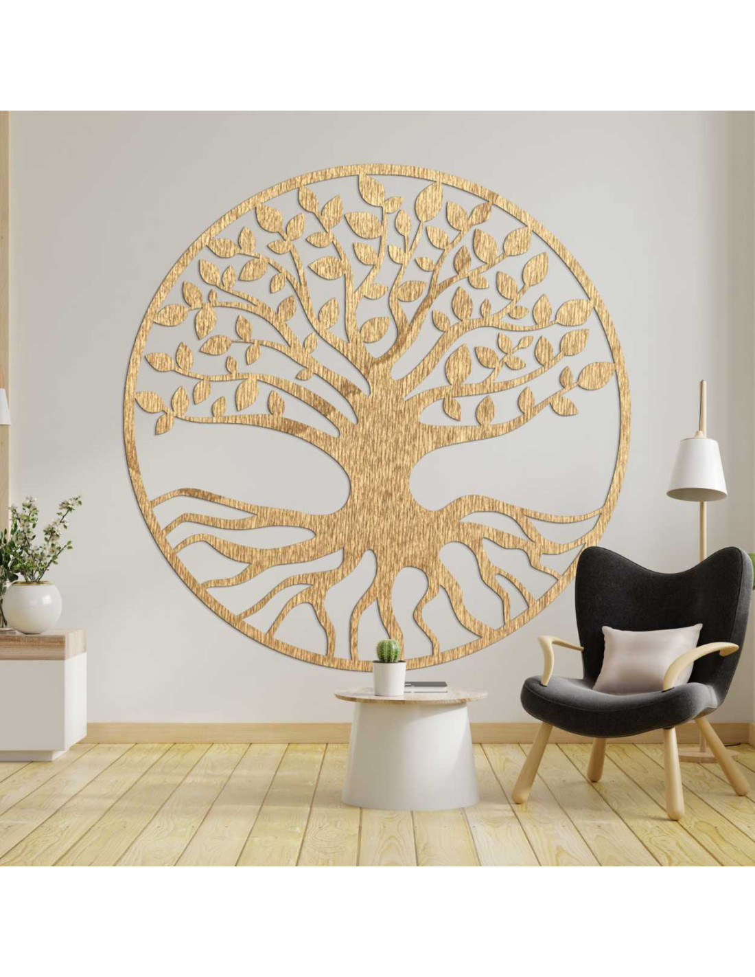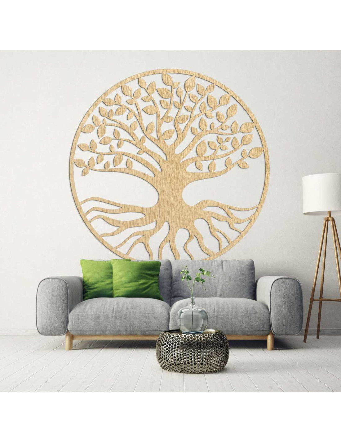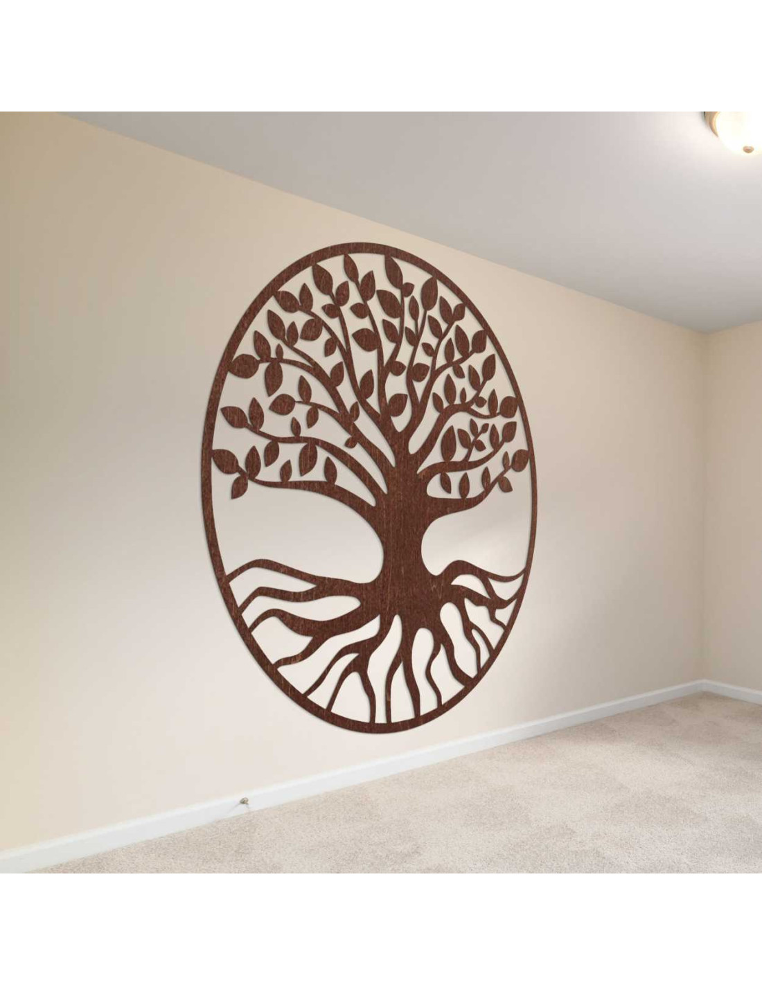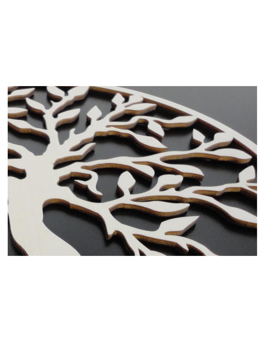 Elegancka drewniana dekoracja przedstawia symbol drzewa życia - związek wzrostu, siły i równowagi.