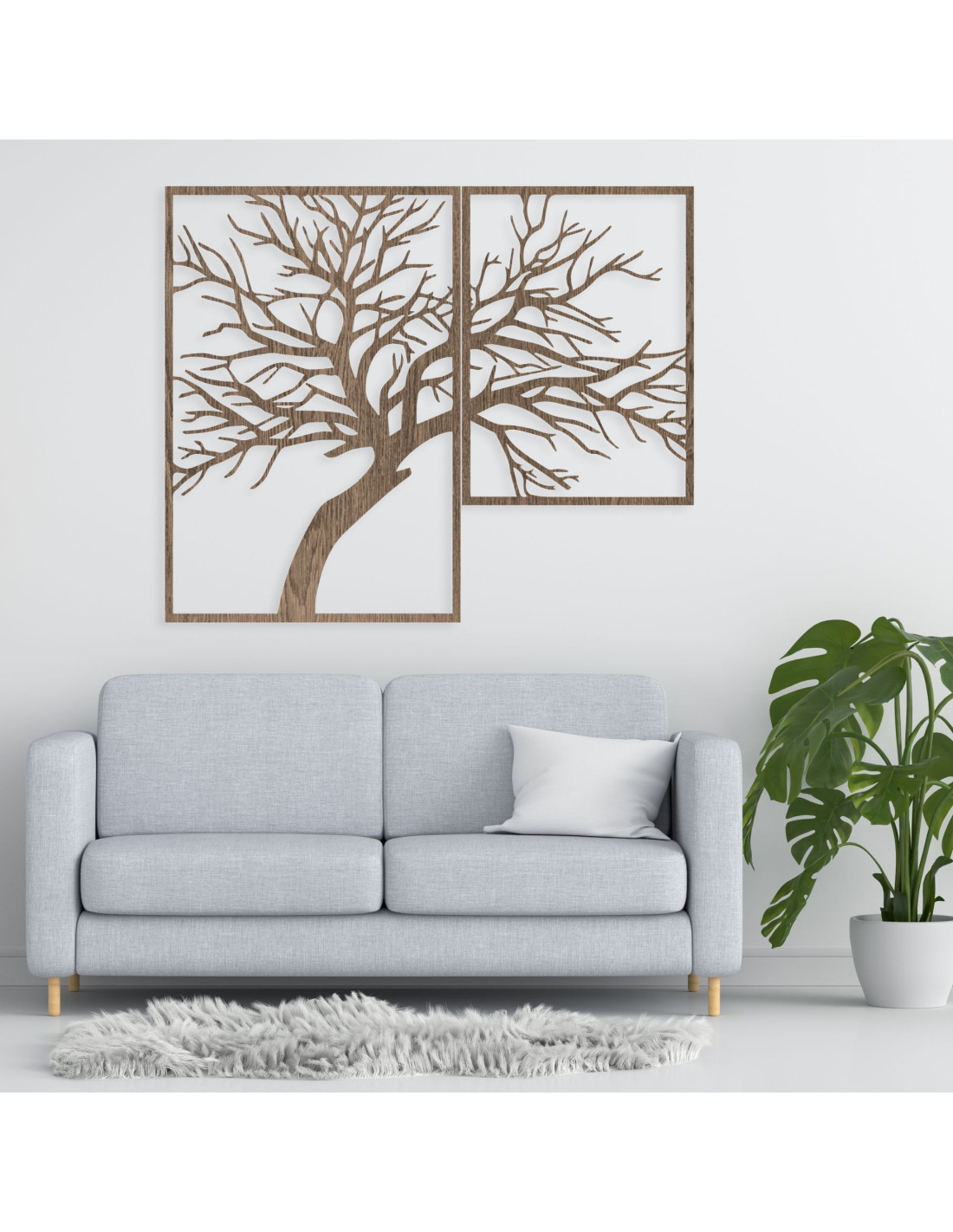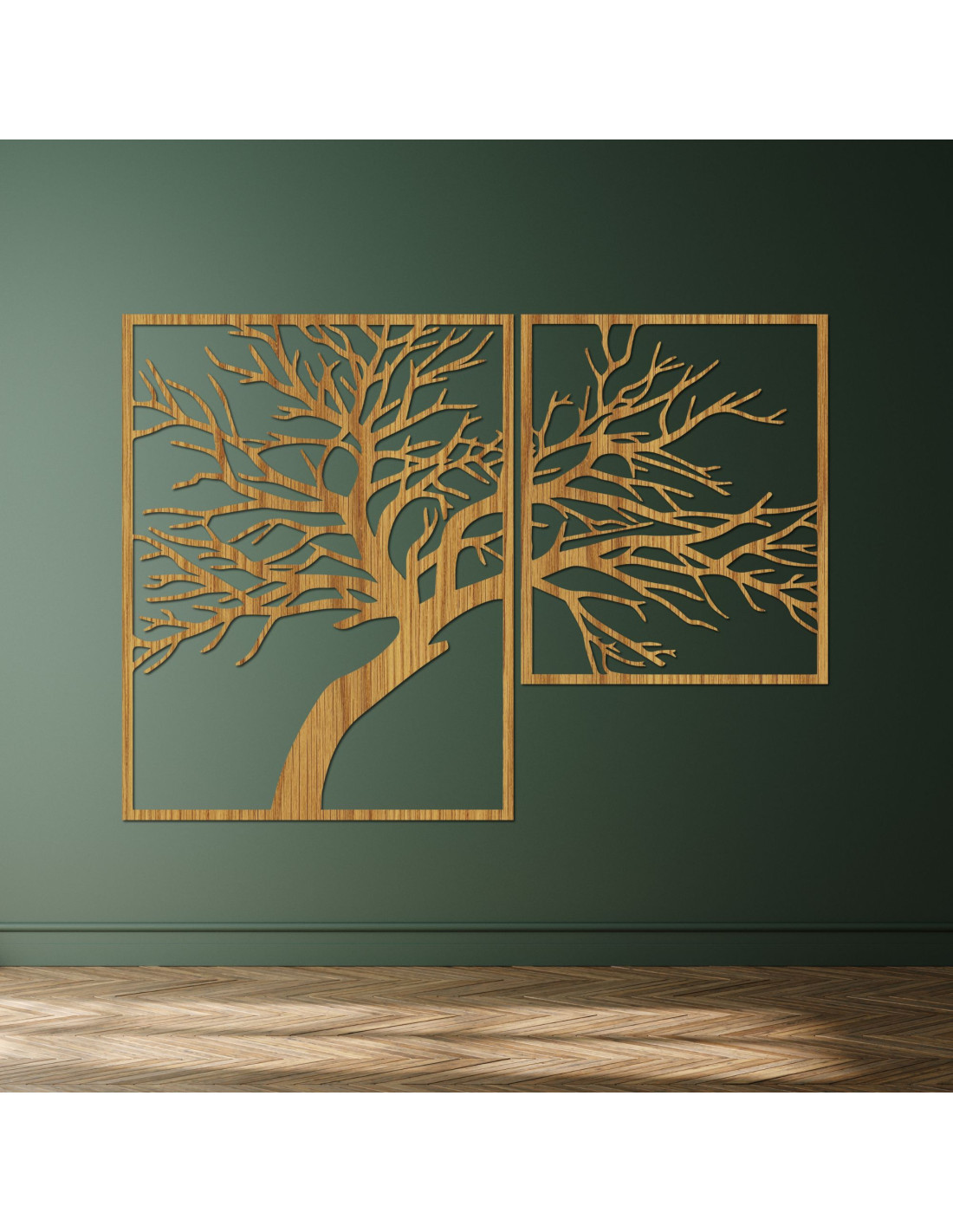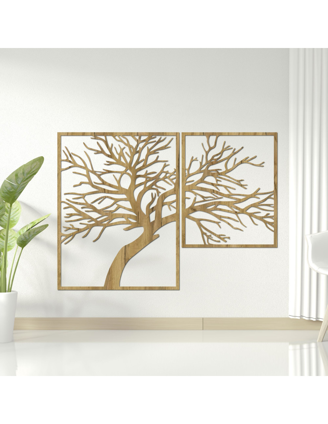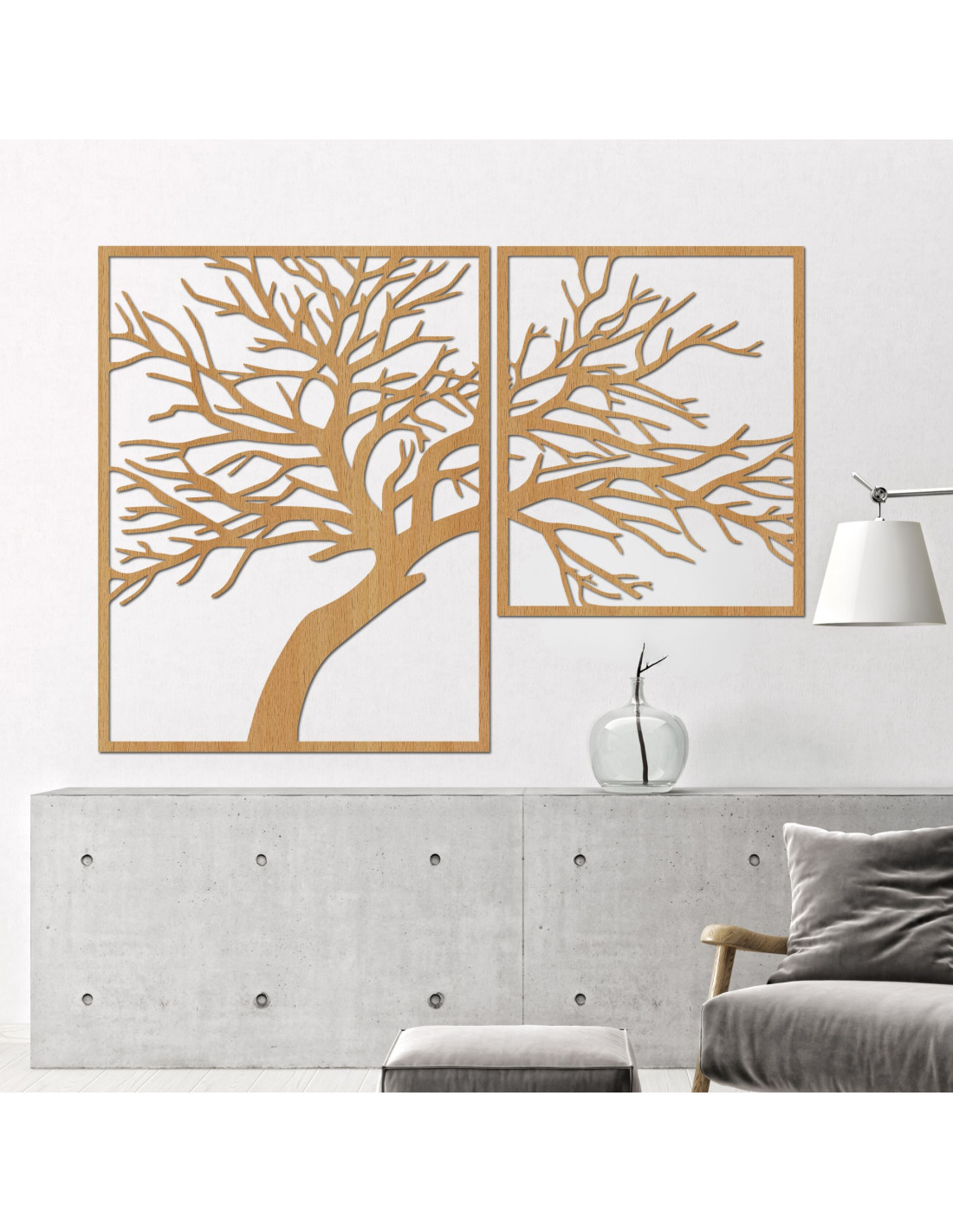 Dwuczęściowy obraz przedstawia eleganckie drzewo z precyzyjnie rzeźbionymi gałęziami, wykonanymi w ciepłych odcieniach drewna .