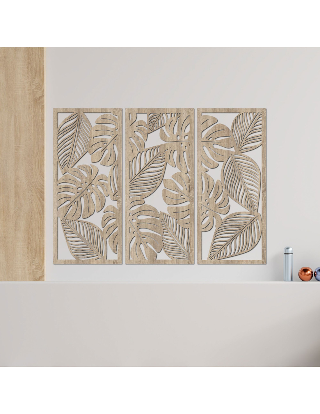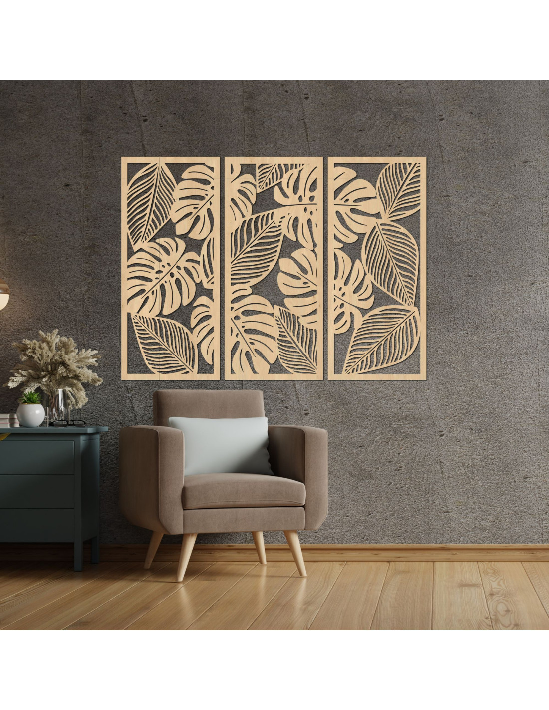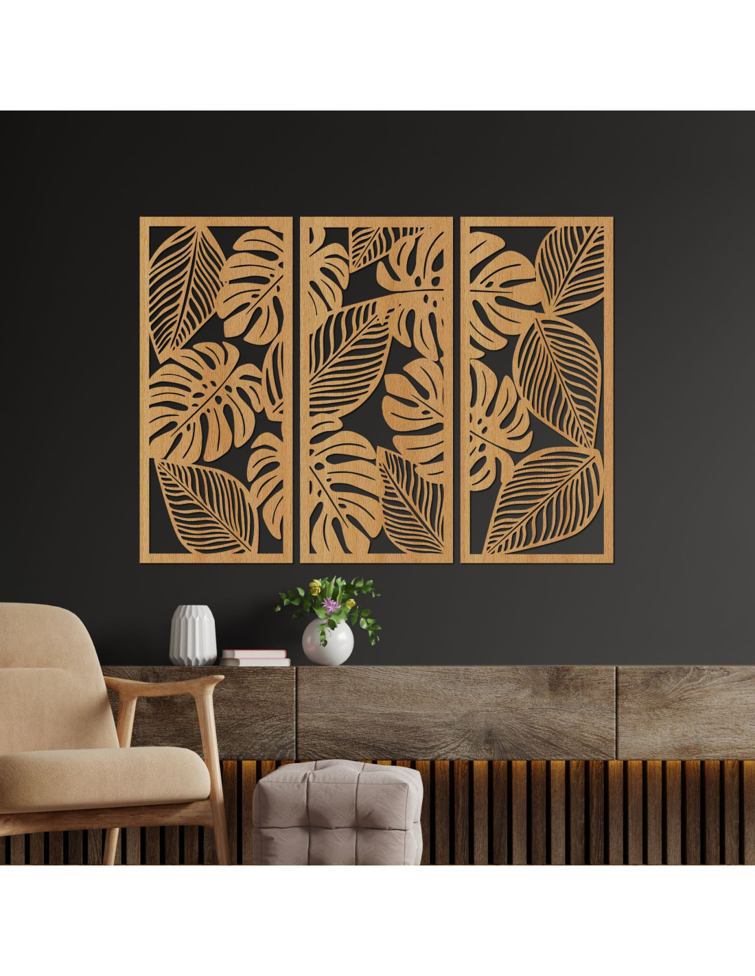 Ciesz się naturalną harmonią z naszą trzyczęściową drewnianą grafiką ścienną Monstera .