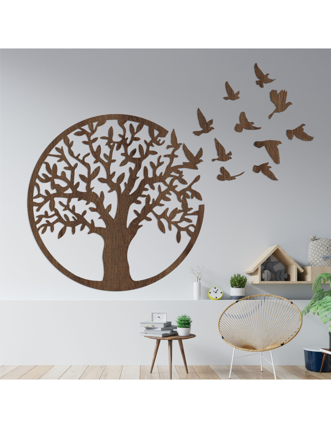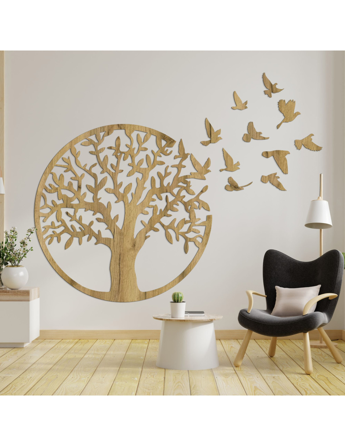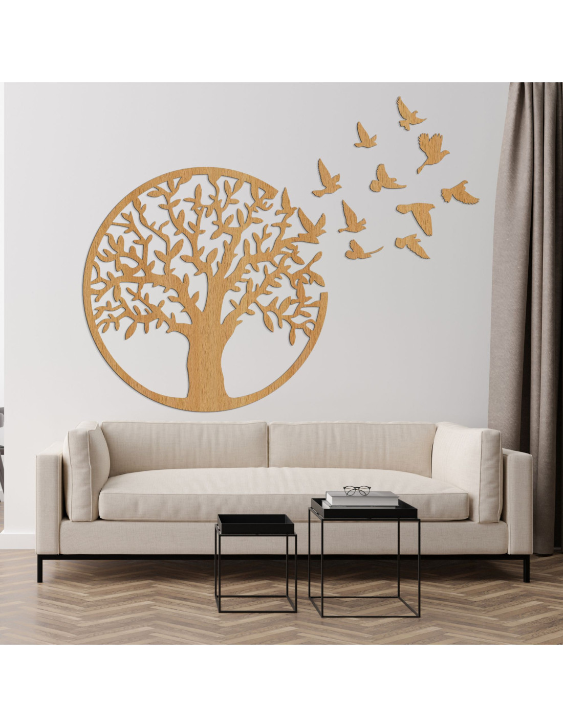 Wprowadź do swojego domu wyjątkowy element natury dzięki naszej eleganckiej drewnianej dekoracji ściennej z motywem drzewa i szybujących ptaków. Ten nowoczesny wzór nie tylko upiększy wnętrze, ale także stworzy przytulną atmosferę. Idealnie sprawdzi się w pokojach dziecięcych, salonach i biurach, gdzie doda przestrzeni ciepła i charakteru. Wykonana z wysokiej jakości drewna, gwarantuje trwałość i długowieczność. Zamów ją już dziś i ożyw swoje ściany! Drewniana dekoracja ścienna Drzewo Życia: Rustykalny panel dekoracyjny do domu