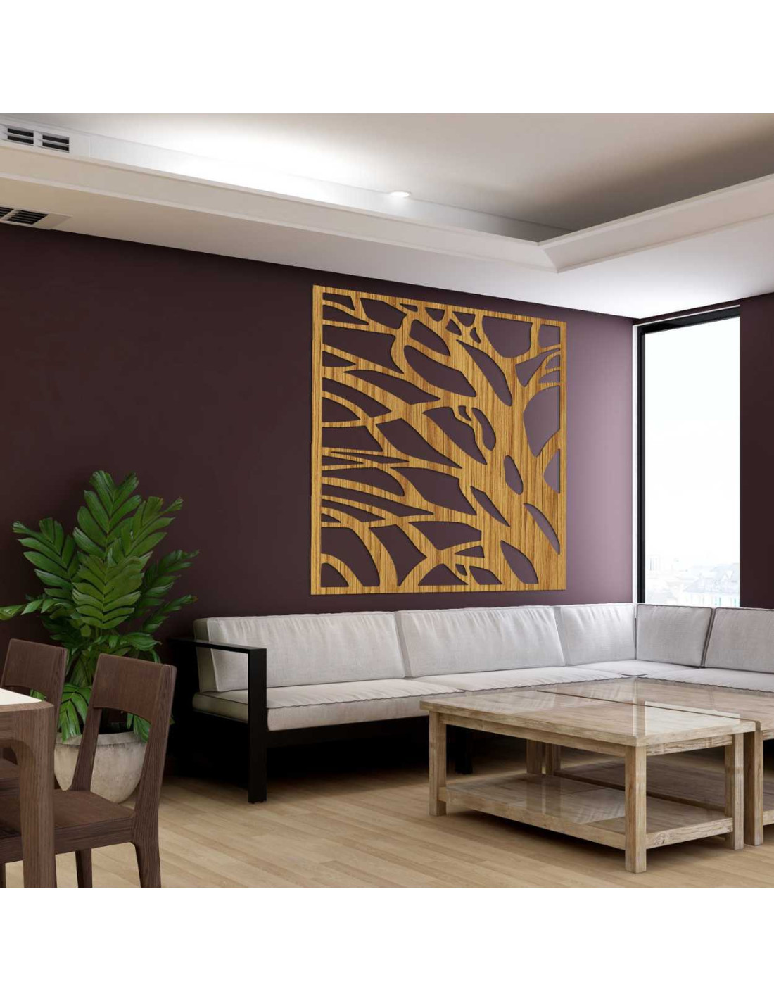 Nowoczesna dekoracja ścienna z motywem drzewa wyrzeźbionego z drewna dodaje przestrzeni naturalnego charakteru i stylowej głębi.