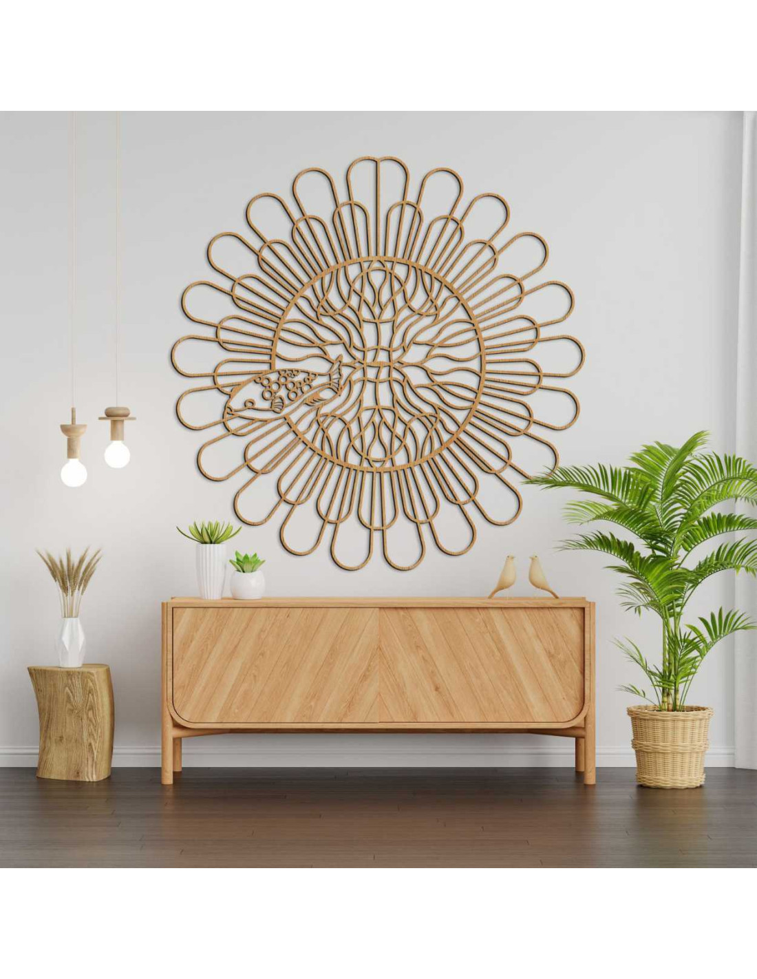 Drewniana dekoracja o organicznych kształtach i skoncentrowanym motywie geometrycznym.