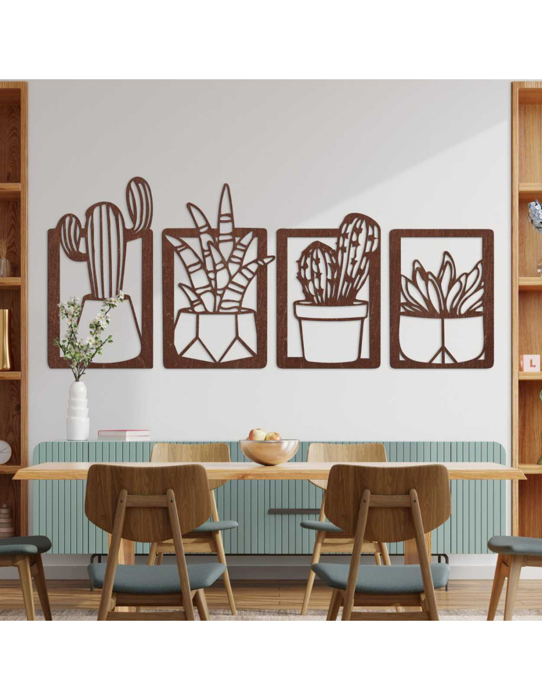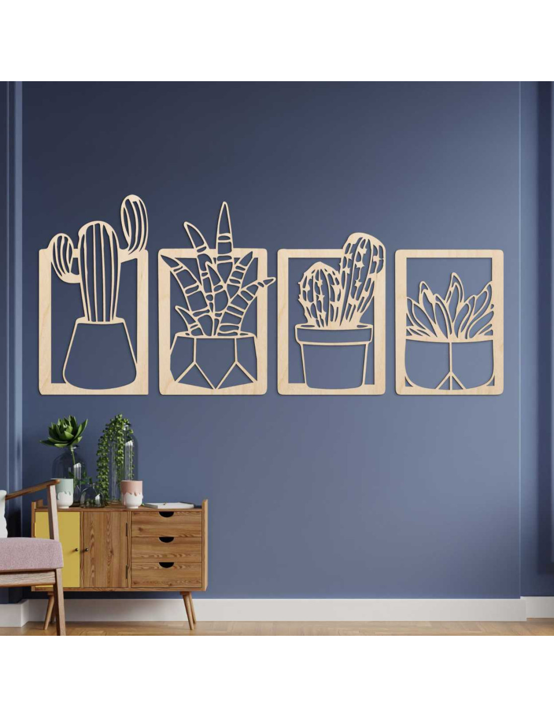 Drewniana dekoracja ścienna z wzorem kaktusów i sukulentów ożywi każde pomieszczenie oryginalnym motywem roślinnym.
