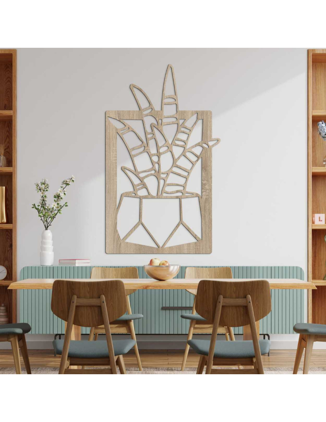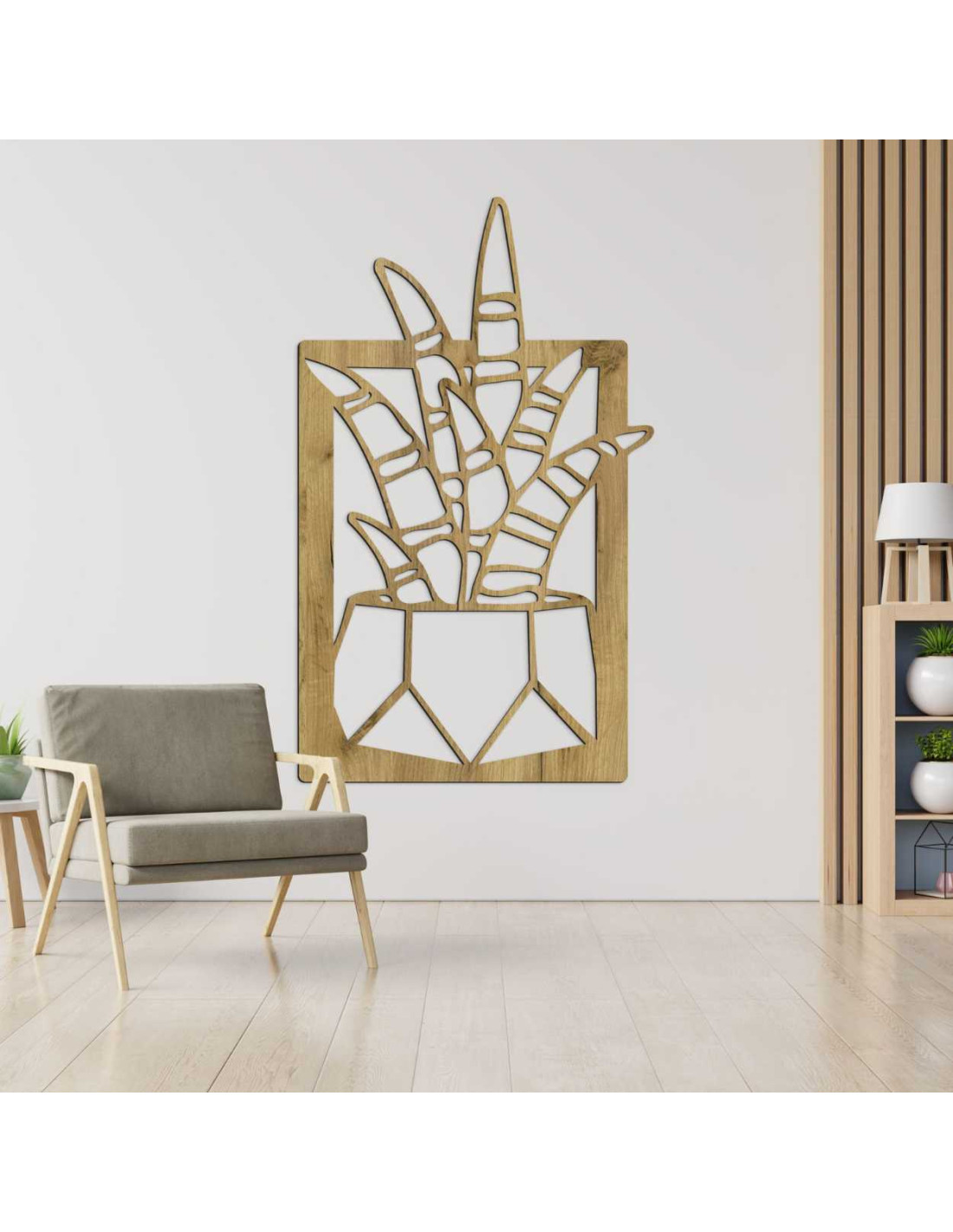 Drewniana dekoracja ścienna z motywem naturalnych roślin i doniczek