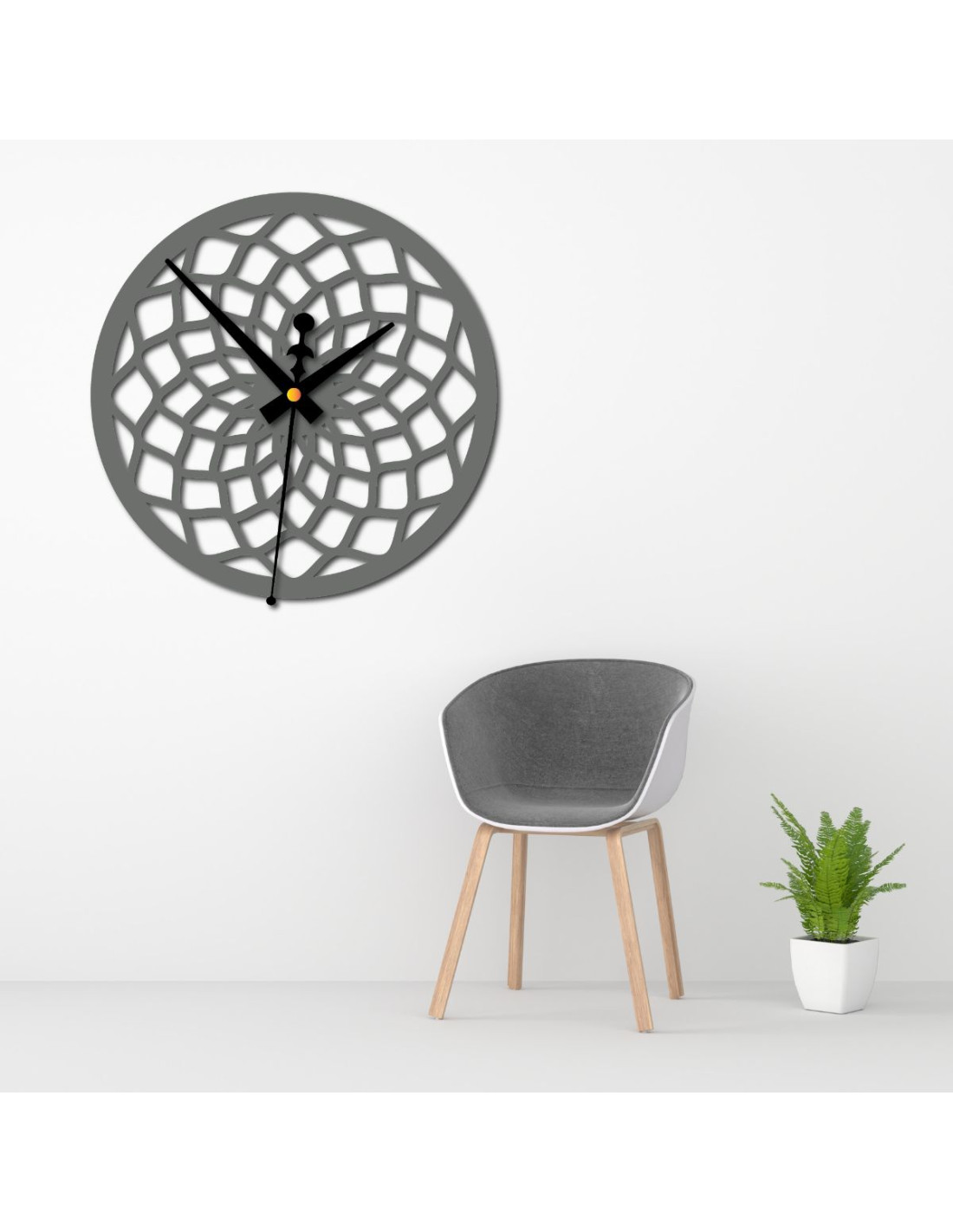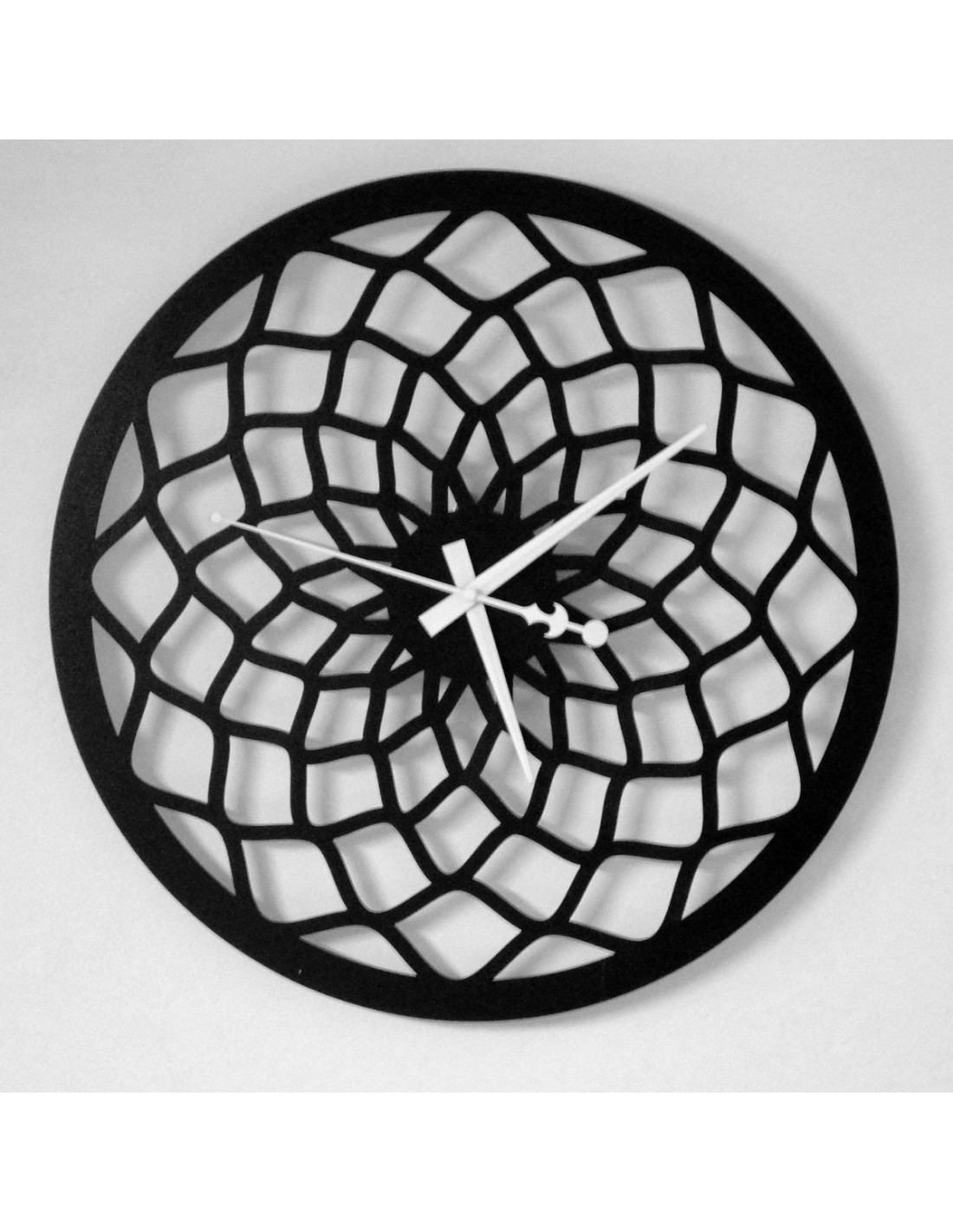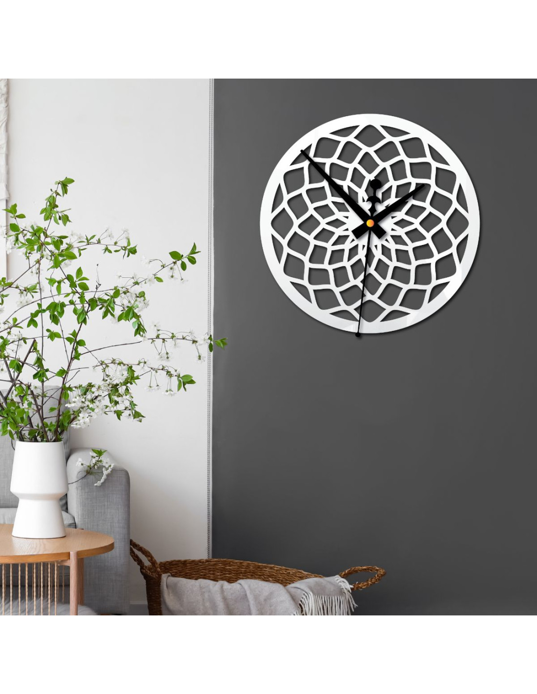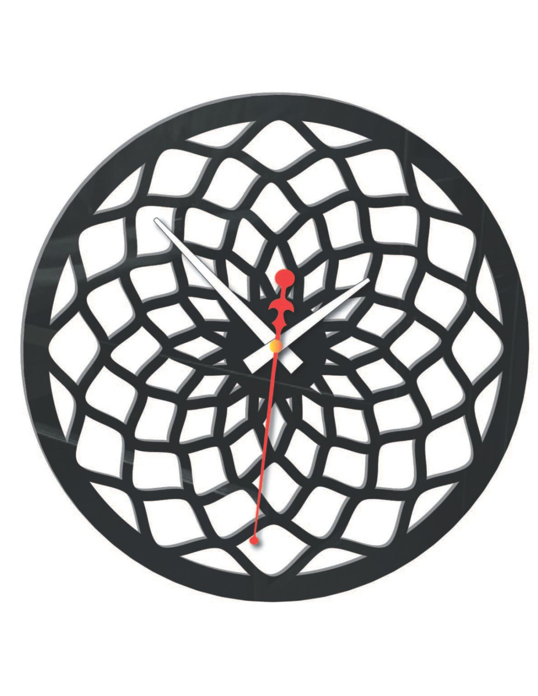 Zegar ma charakterystyczny wzór przypominający abstrakcyjną siatkę lub ukształtowane promienie, co czyni go efektownym elementem dekoracyjnym każdego wnętrza.