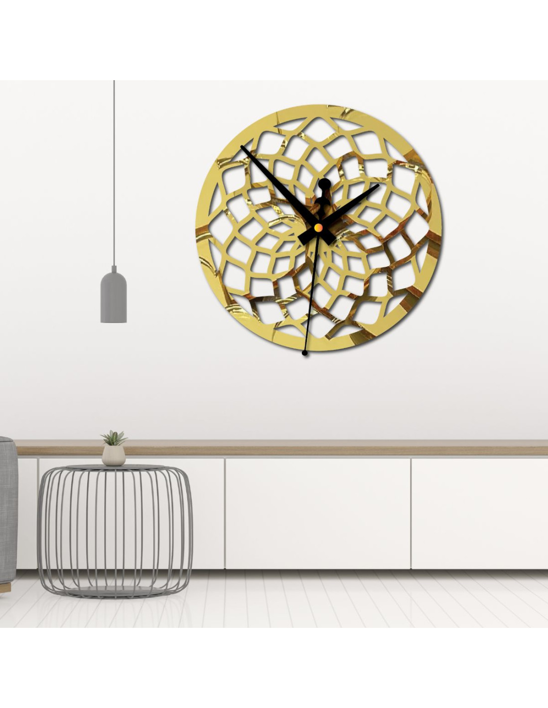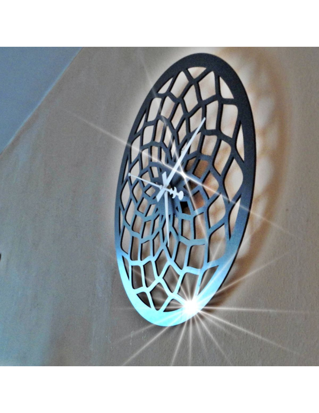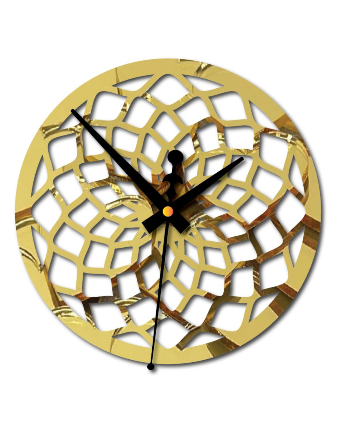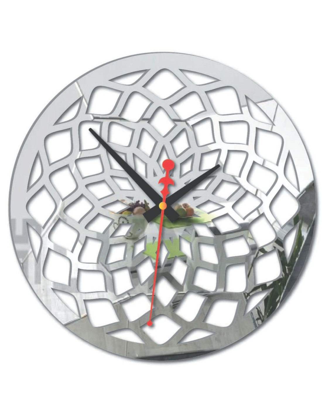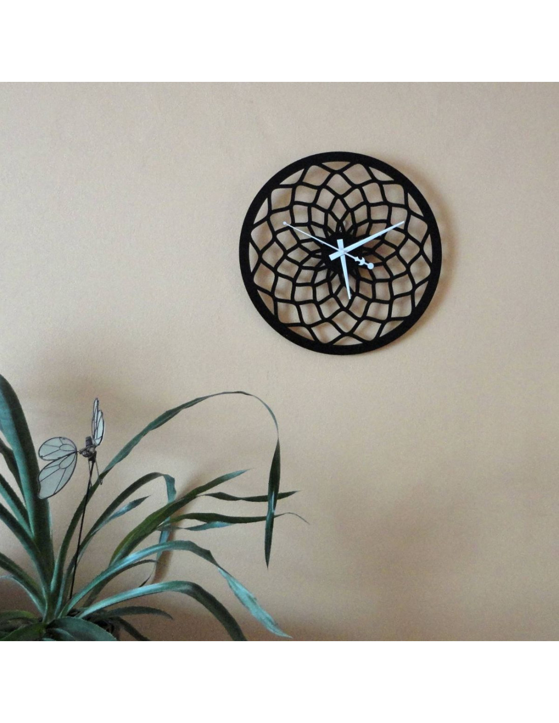Zegar ma charakterystyczny wzór przypominający abstrakcyjną siatkę lub ukształtowane promienie, co czyni go efektownym elementem dekoracyjnym każdego wnętrza.