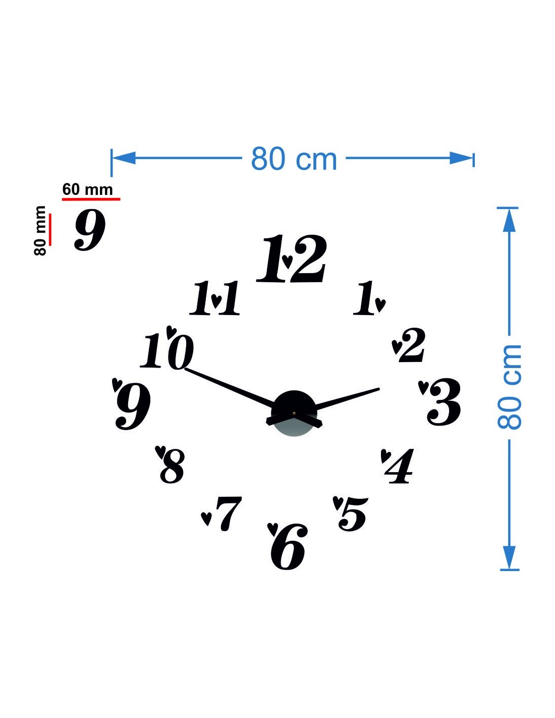 Minimalne wymiary naklejki: 800 x 800 mm, możliwość powiększenia do 1300 x 1300 mm. Wymiary mechanizmu zegarowego: 100 x 100 mm. Długość wskazówek: 30 - 40 cm.