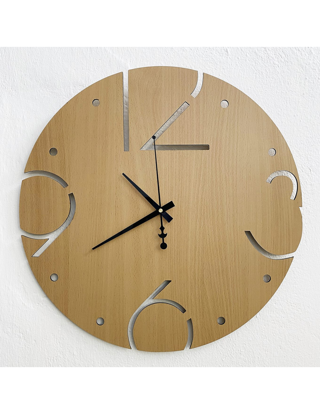 Okrągły zegar ścienny z wyciętymi cyframi, bez ramki, o naturalnym wyglądzie drewna.