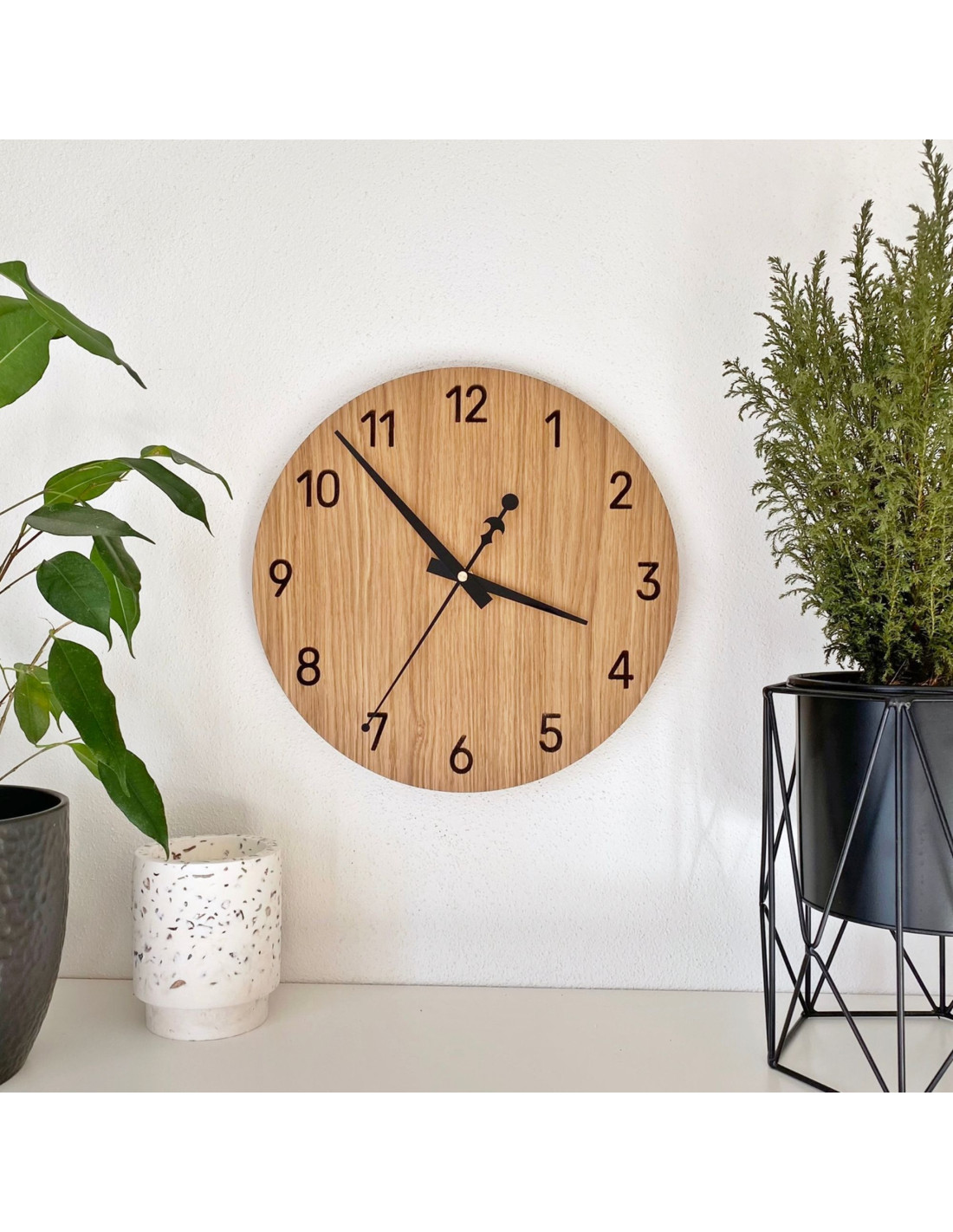 Ten dębowy zegar ścienny wyróżnia się zarówno w rustykalnych, jak i nowoczesnych wnętrzach. Jego naturalny wygląd w połączeniu z czarnymi wskazówkami dodaje przestrzeni minimalistycznej elegancji. Pasuje do różnych stylów – od rustykalnego po nowoczesny, zarówno do domu, jak i na taras.