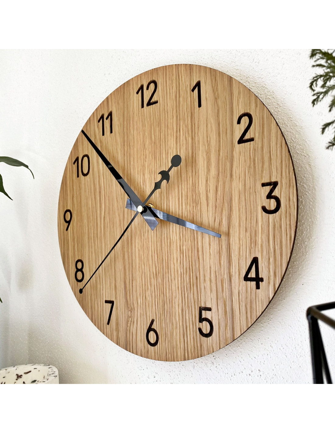 • Naturalny i elegancki design : drewno dębowe i czarne metalowe wskazówki tworzą nowoczesny, minimalistyczny styl.