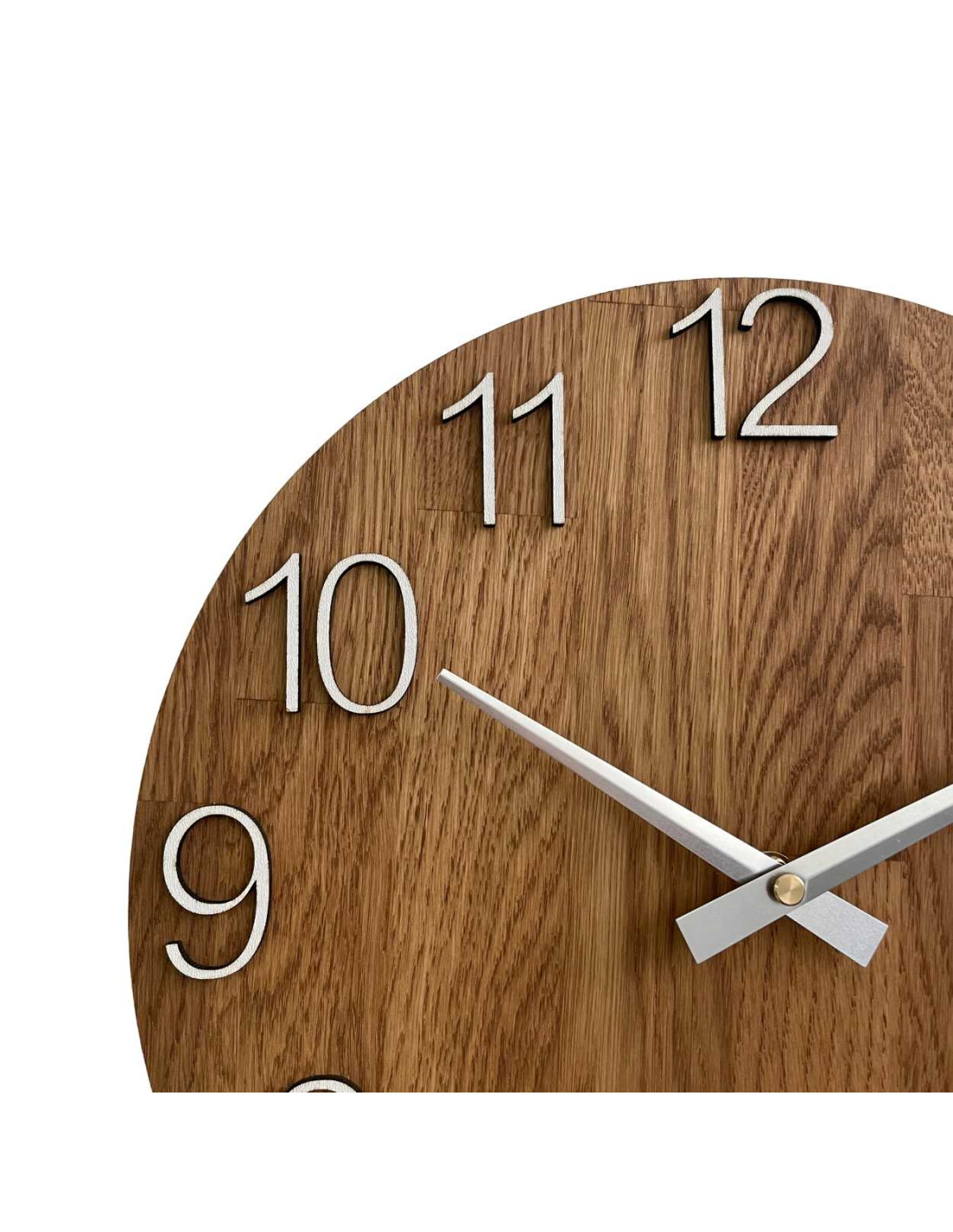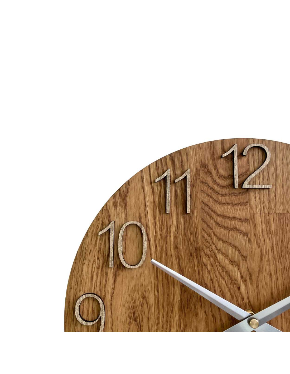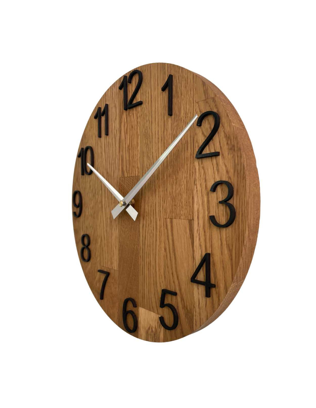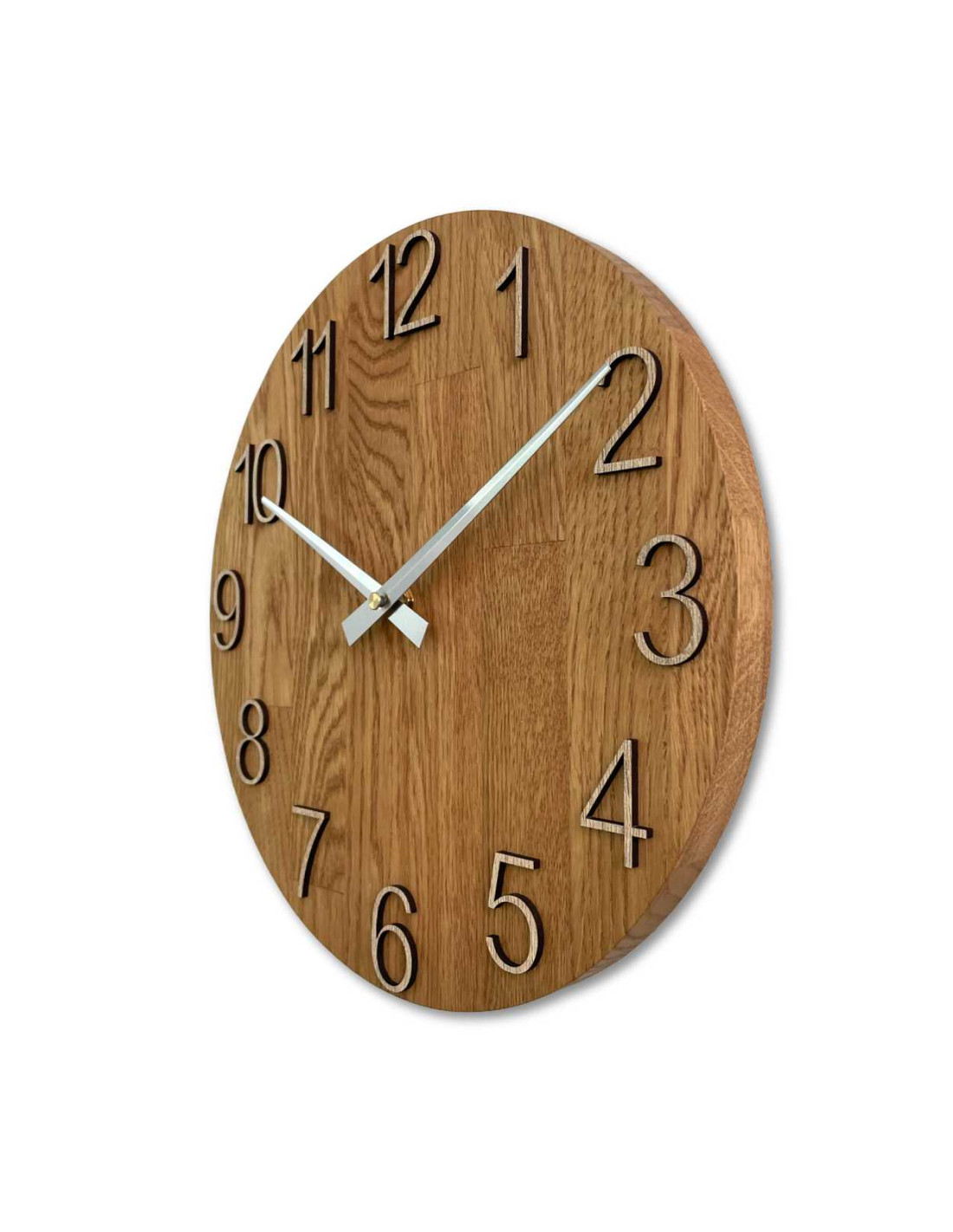 Każdy zegar wykonany jest z litych paneli dębowych, które najpierw są precyzyjnie wycinane przy użyciu technologii CNC, nadając im pożądany kształt i rozmiar.