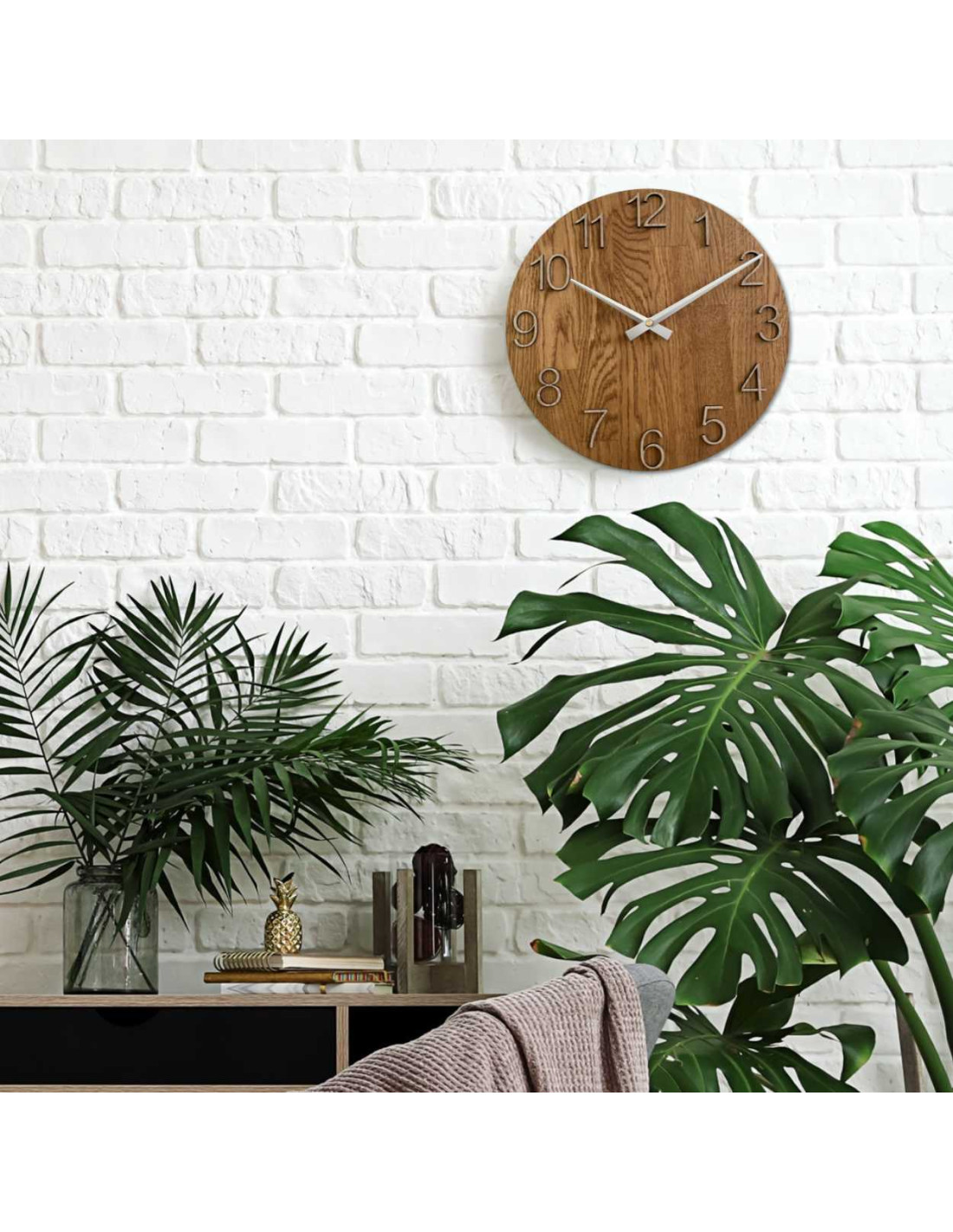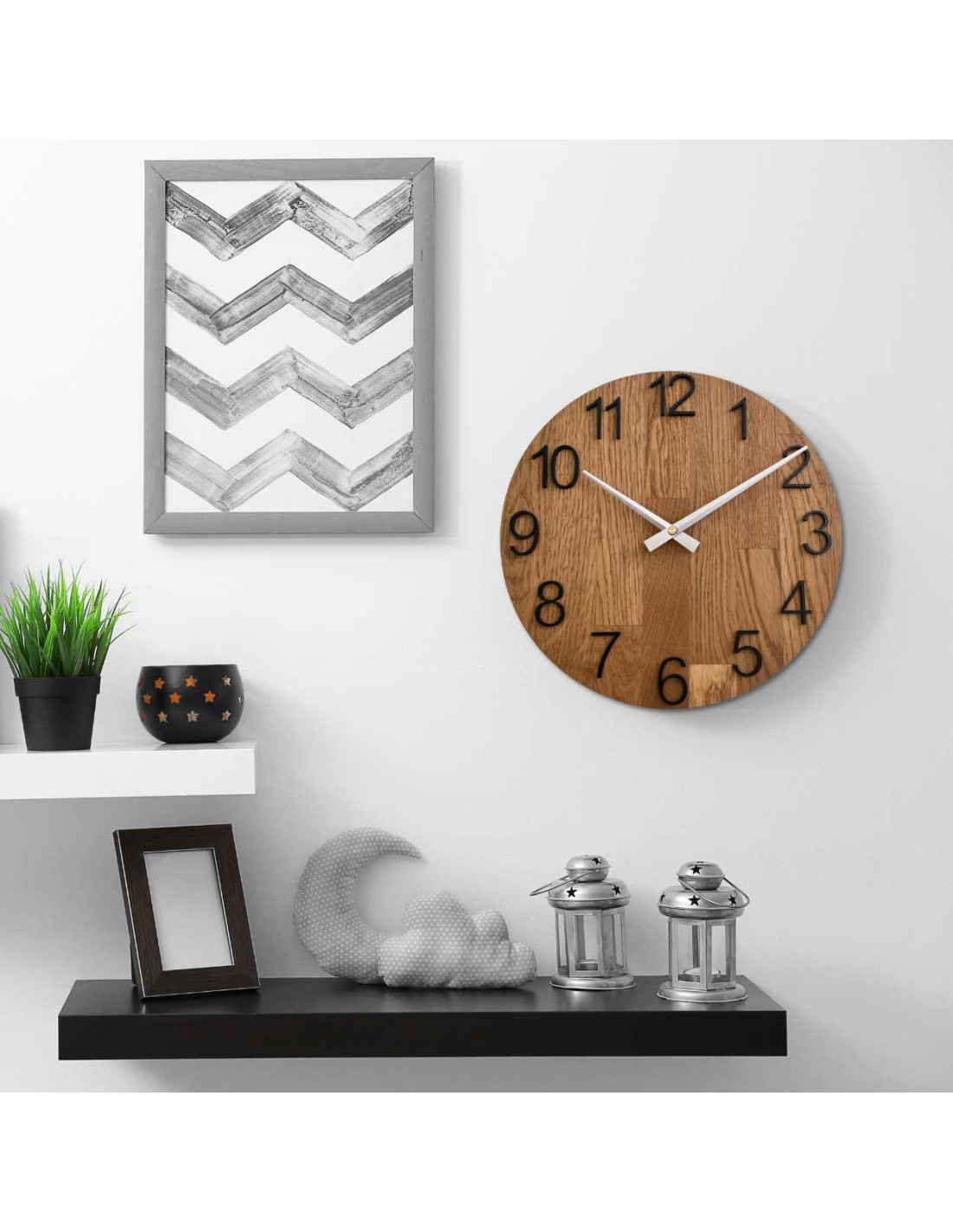 - Naturalny i elegancki design: Połączenie drewna dębowego i metalowych wskazówek tworzy nowoczesny, a zarazem ponadczasowy wygląd.