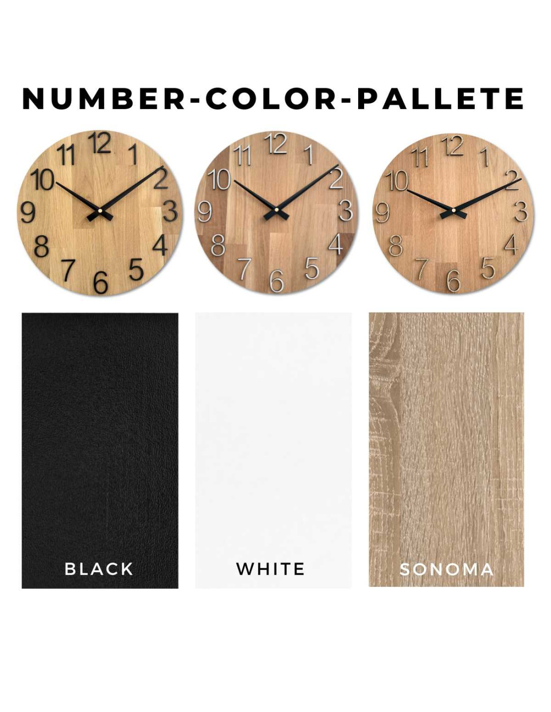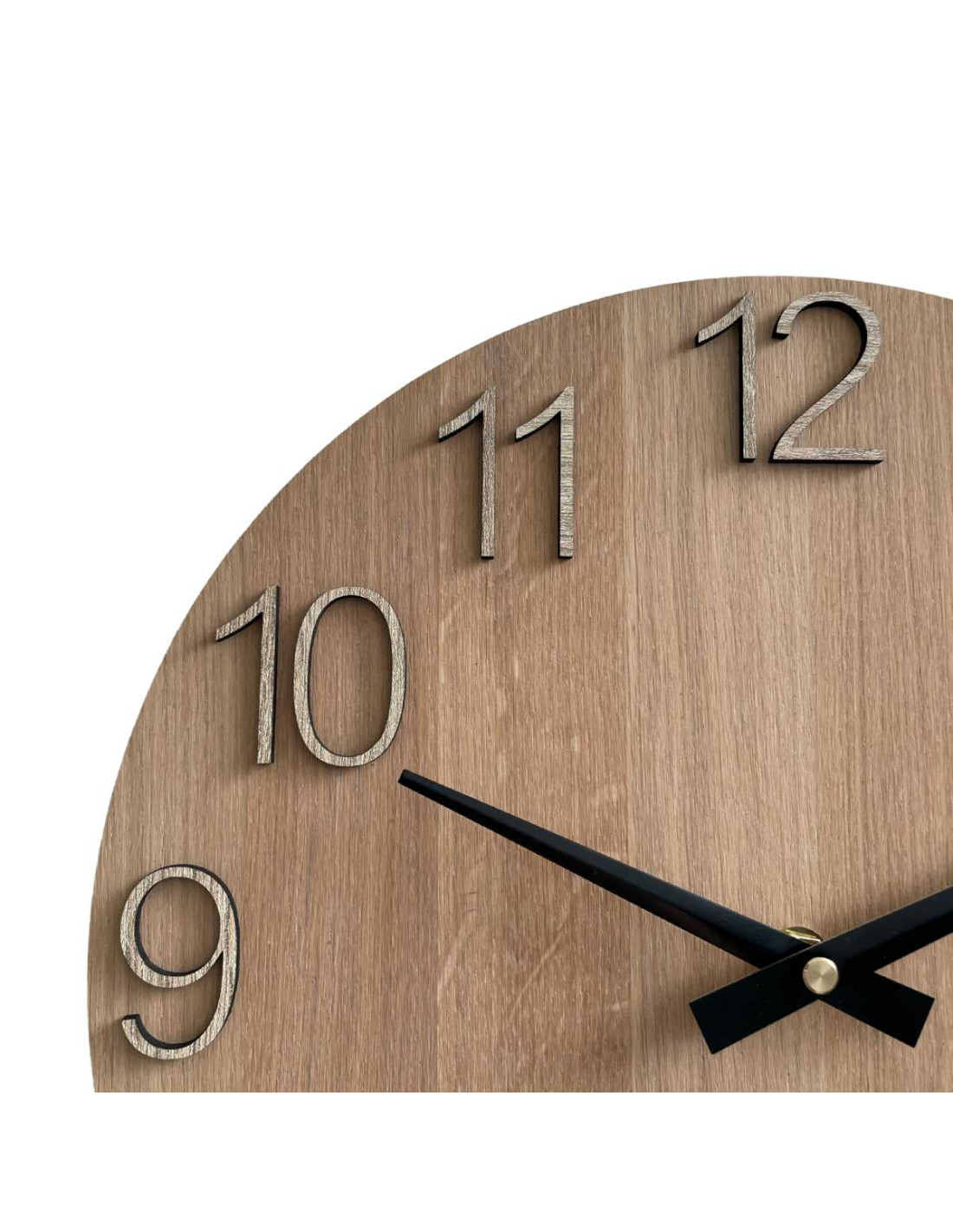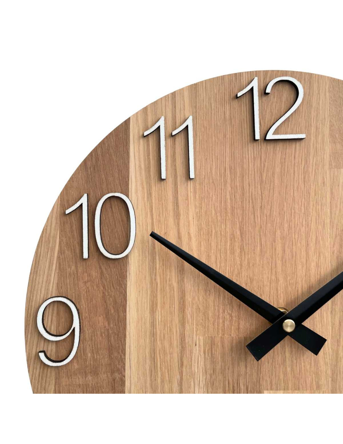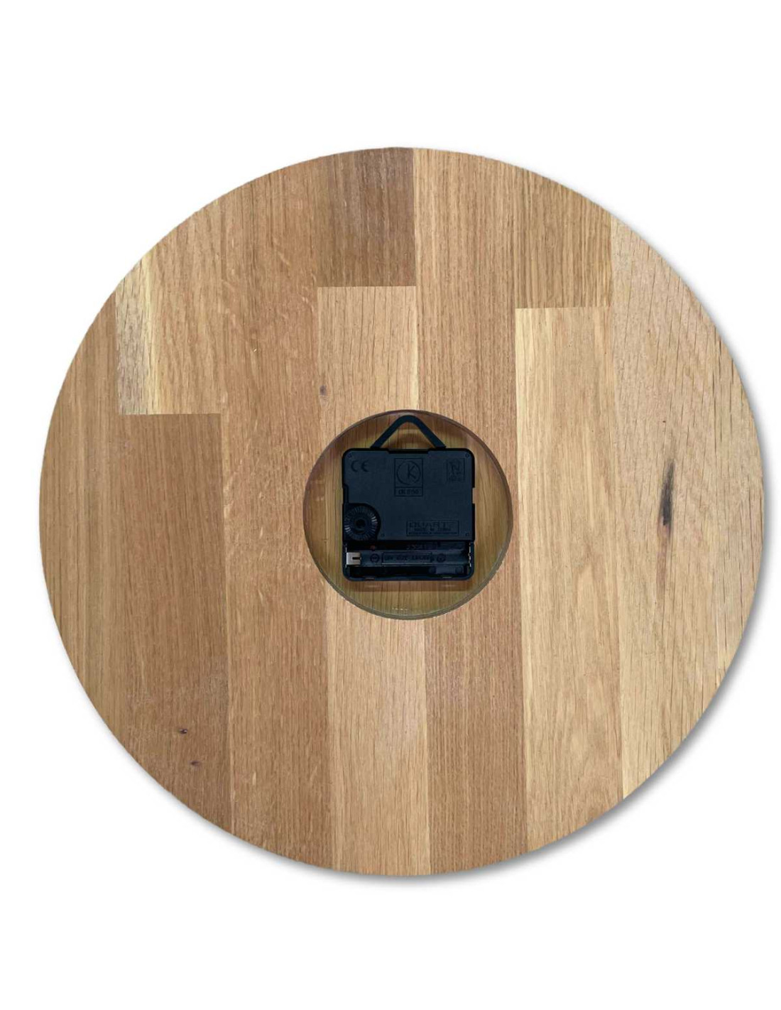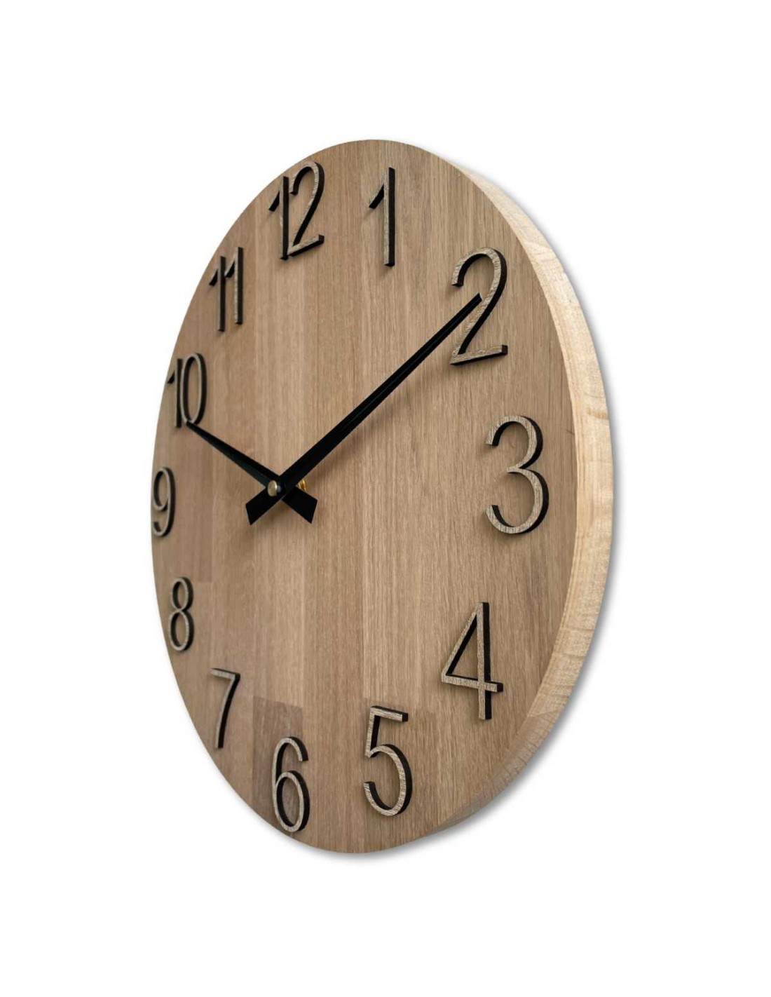 Każdy zegar wykonany jest z litych paneli dębowych, które najpierw są precyzyjnie wycinane przy użyciu technologii CNC, nadając im pożądany kształt i rozmiar.