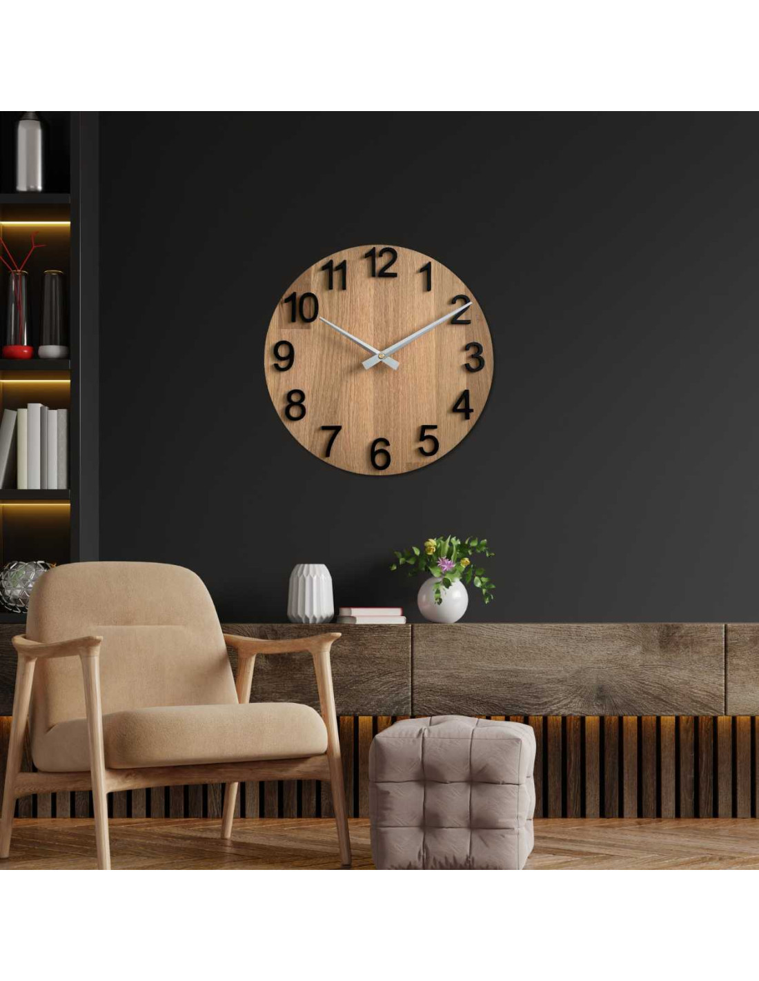 - Elegancki design: połączenie drewna dębowego i metalowych wskazówek tworzy nowoczesny, a zarazem ponadczasowy wygląd.