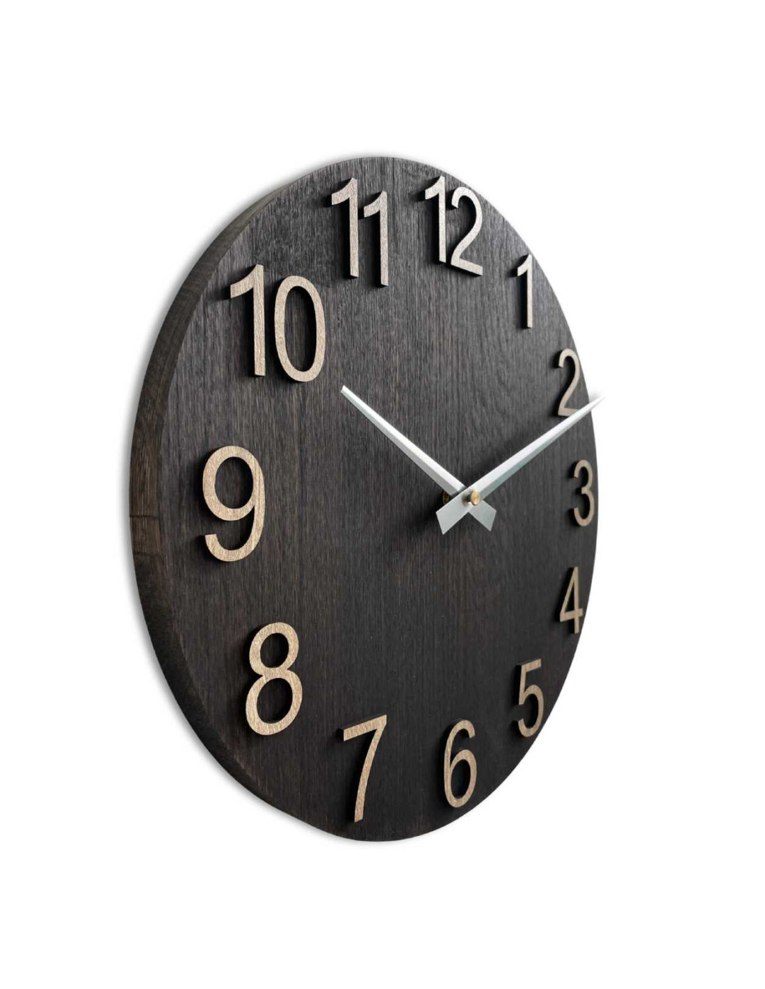 Każdy zegar wykonany jest z litych paneli dębowych, które najpierw są precyzyjnie wycinane przy użyciu technologii CNC, nadając im pożądany kształt i rozmiar.