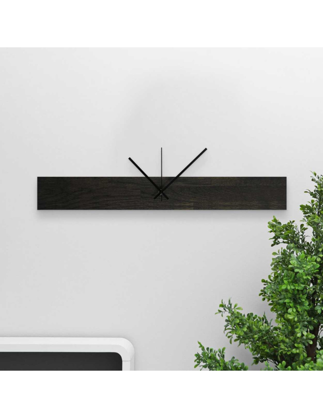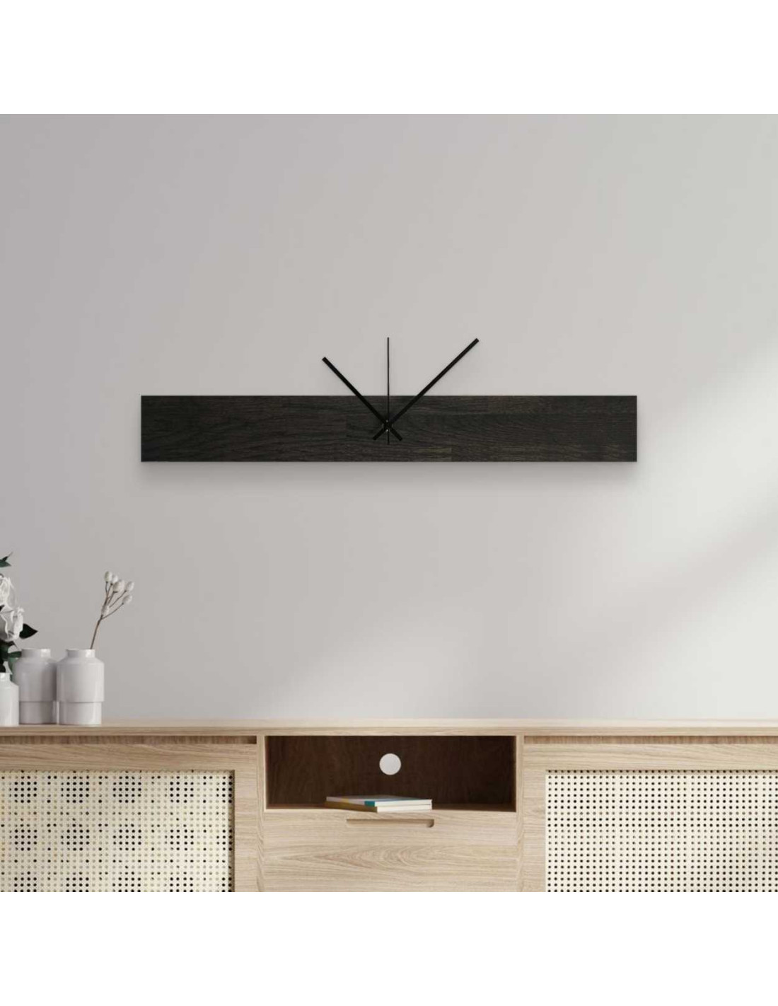 Nowoczesny drewniany zegar ścienny o eleganckiej sylwetce.