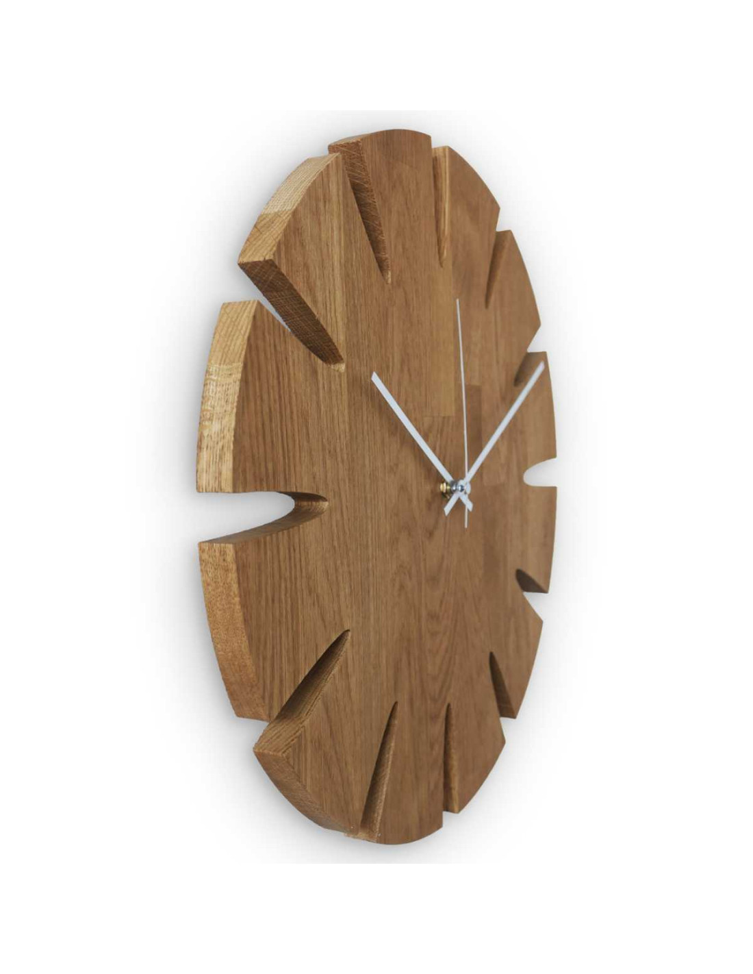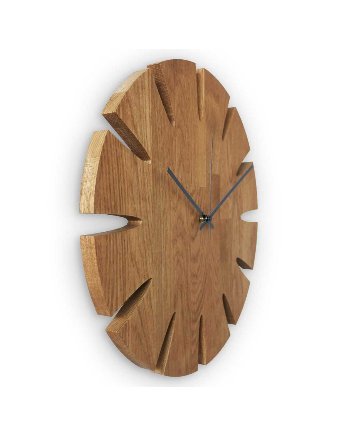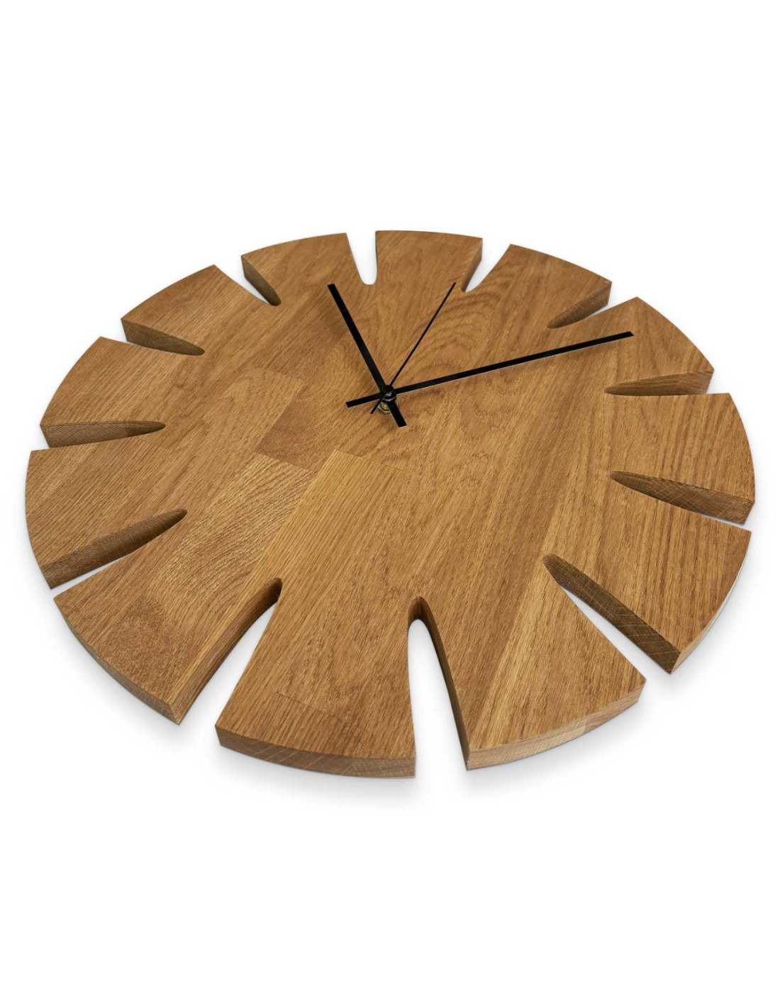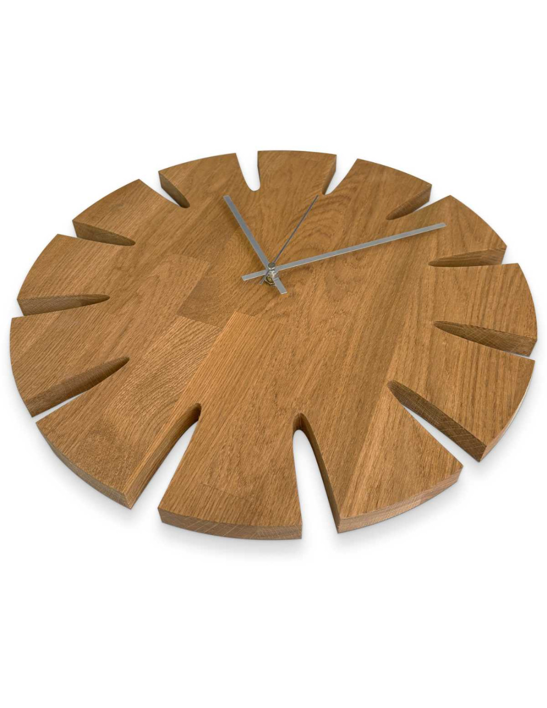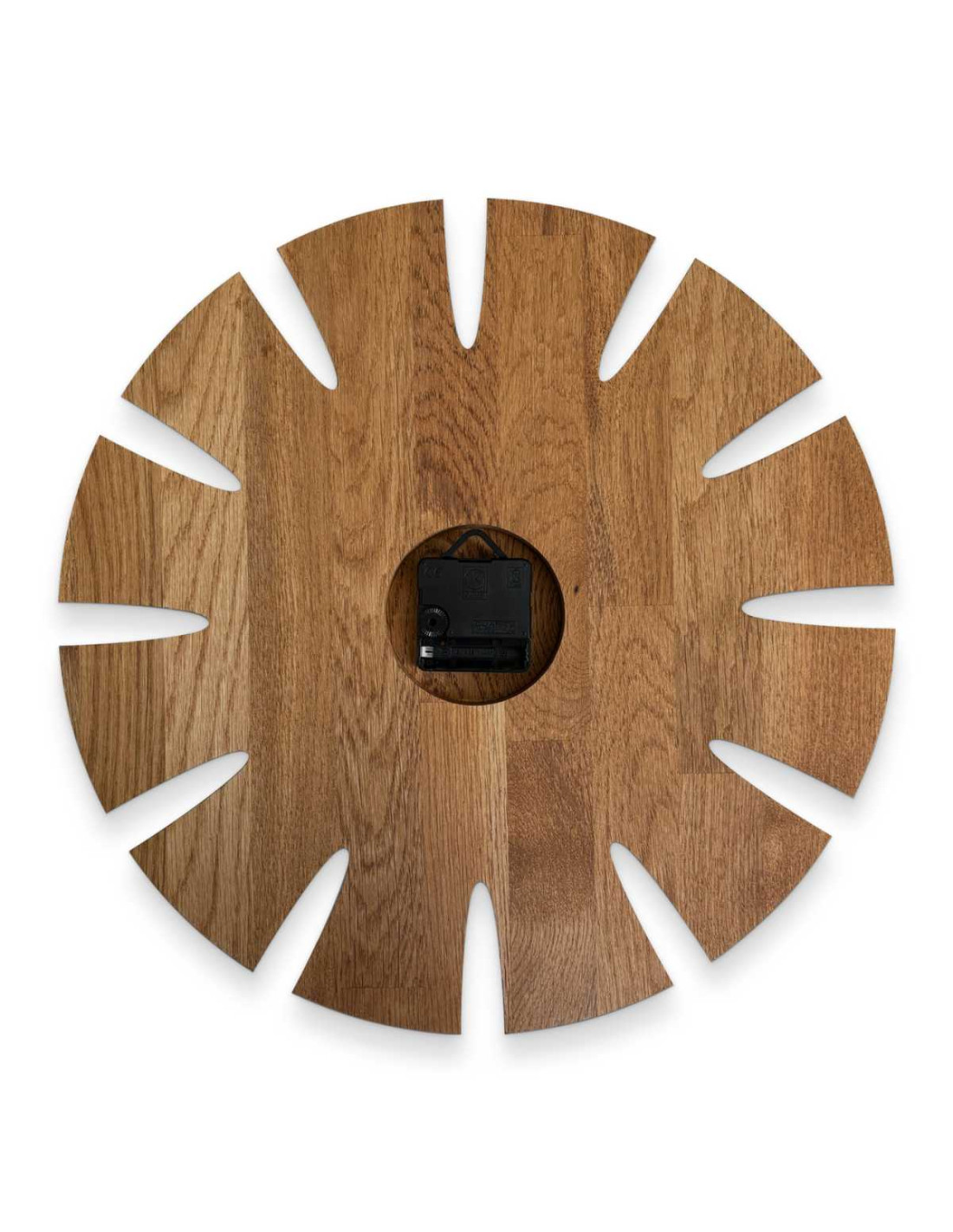 Każdy zegar wykonany jest z litych paneli dębowych, które najpierw są precyzyjnie wycinane przy użyciu technologii CNC, nadając im pożądany kształt i rozmiar.
