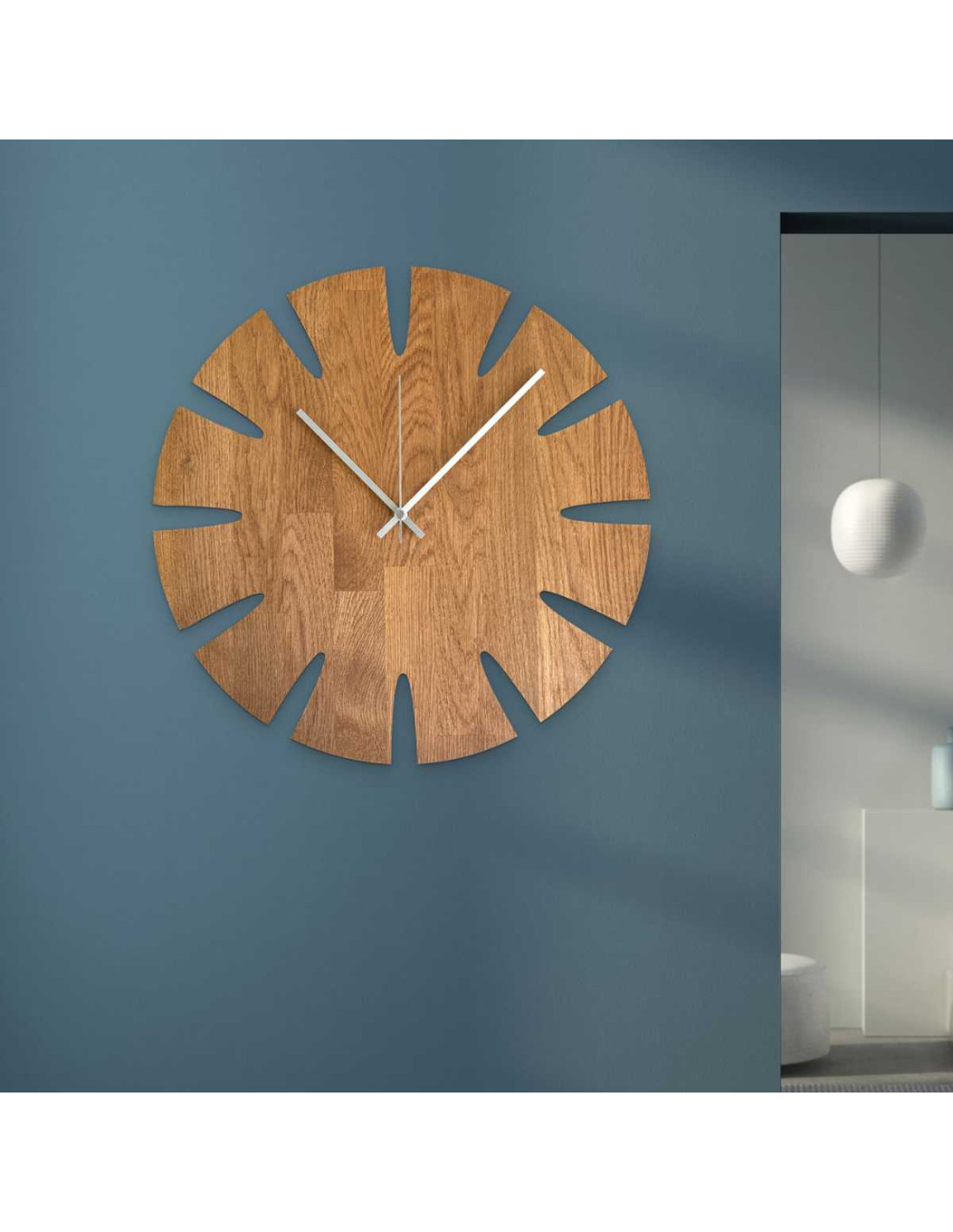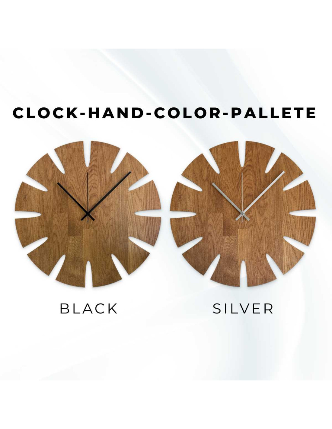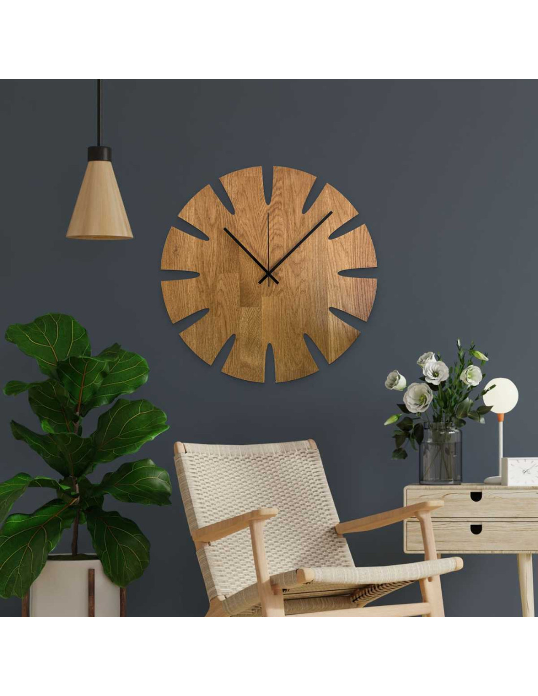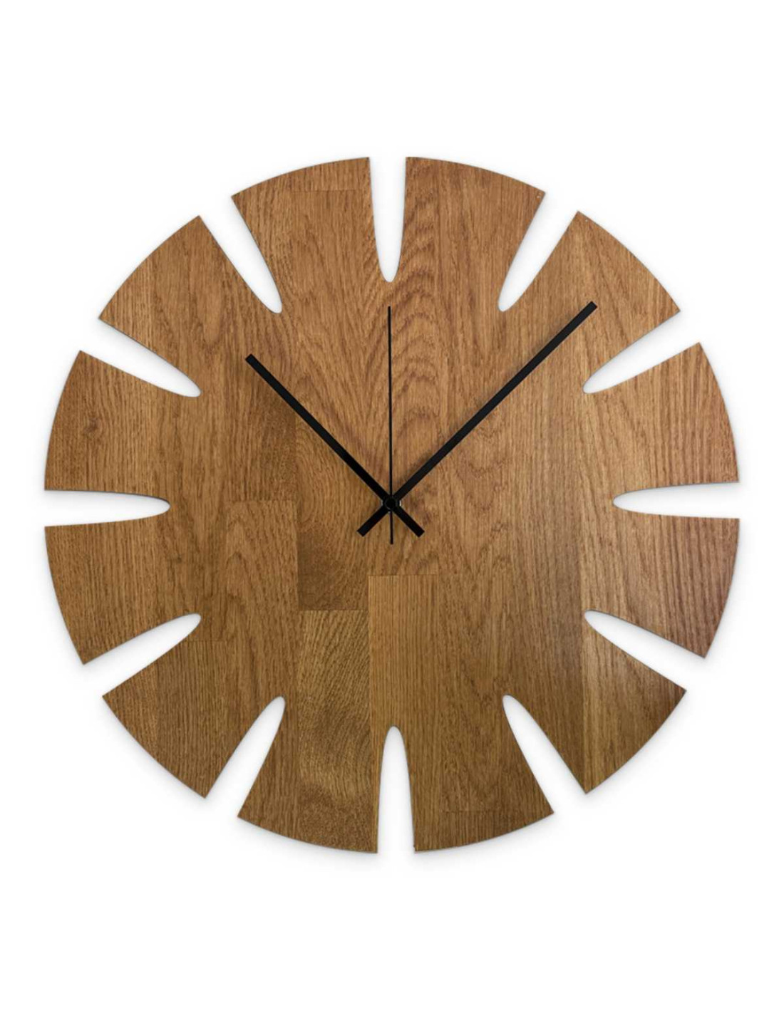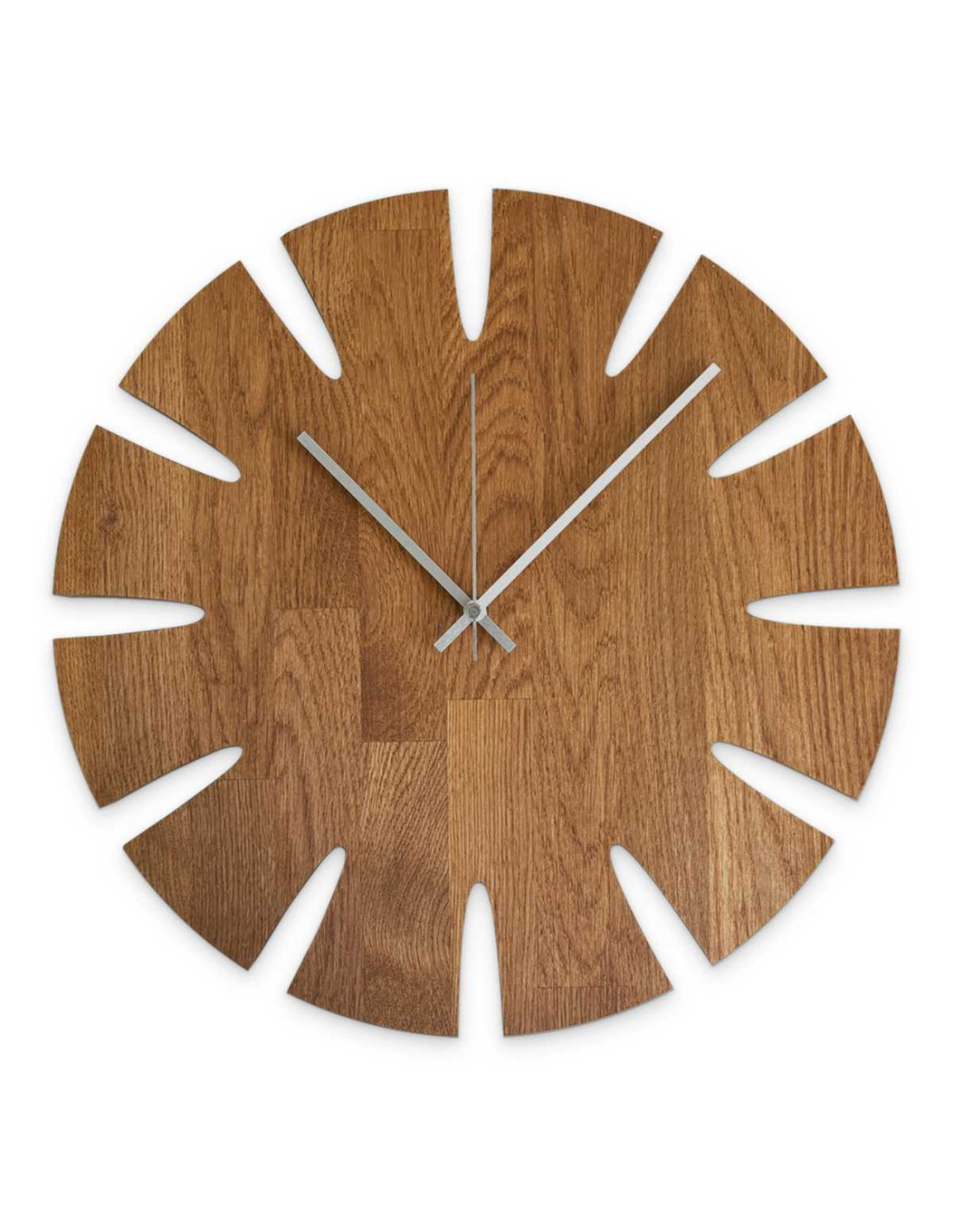Każdy zegar wykonany jest z litych paneli dębowych, które najpierw są precyzyjnie wycinane przy użyciu technologii CNC, nadając im pożądany kształt i rozmiar.