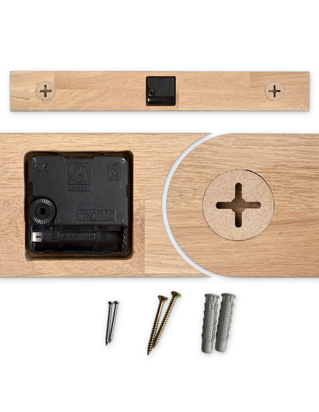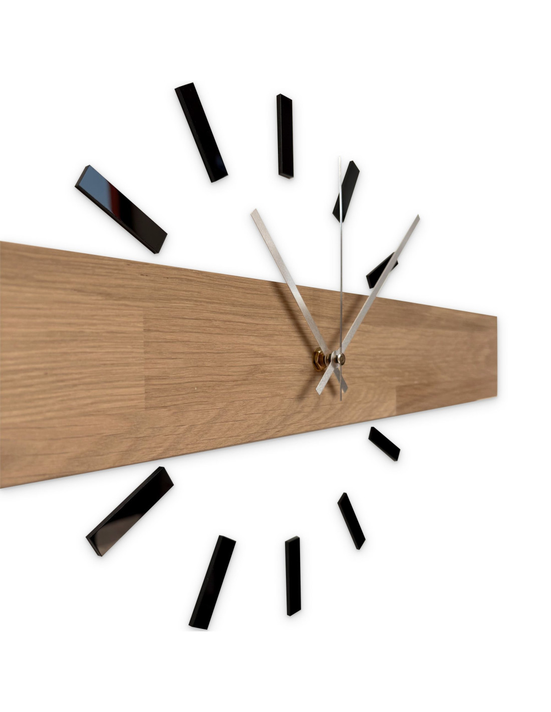 Każdy zegar wykonany jest z litych paneli dębowych , które najpierw są precyzyjnie wycinane przy użyciu technologii CNC, nadając im pożądany kształt i rozmiar.