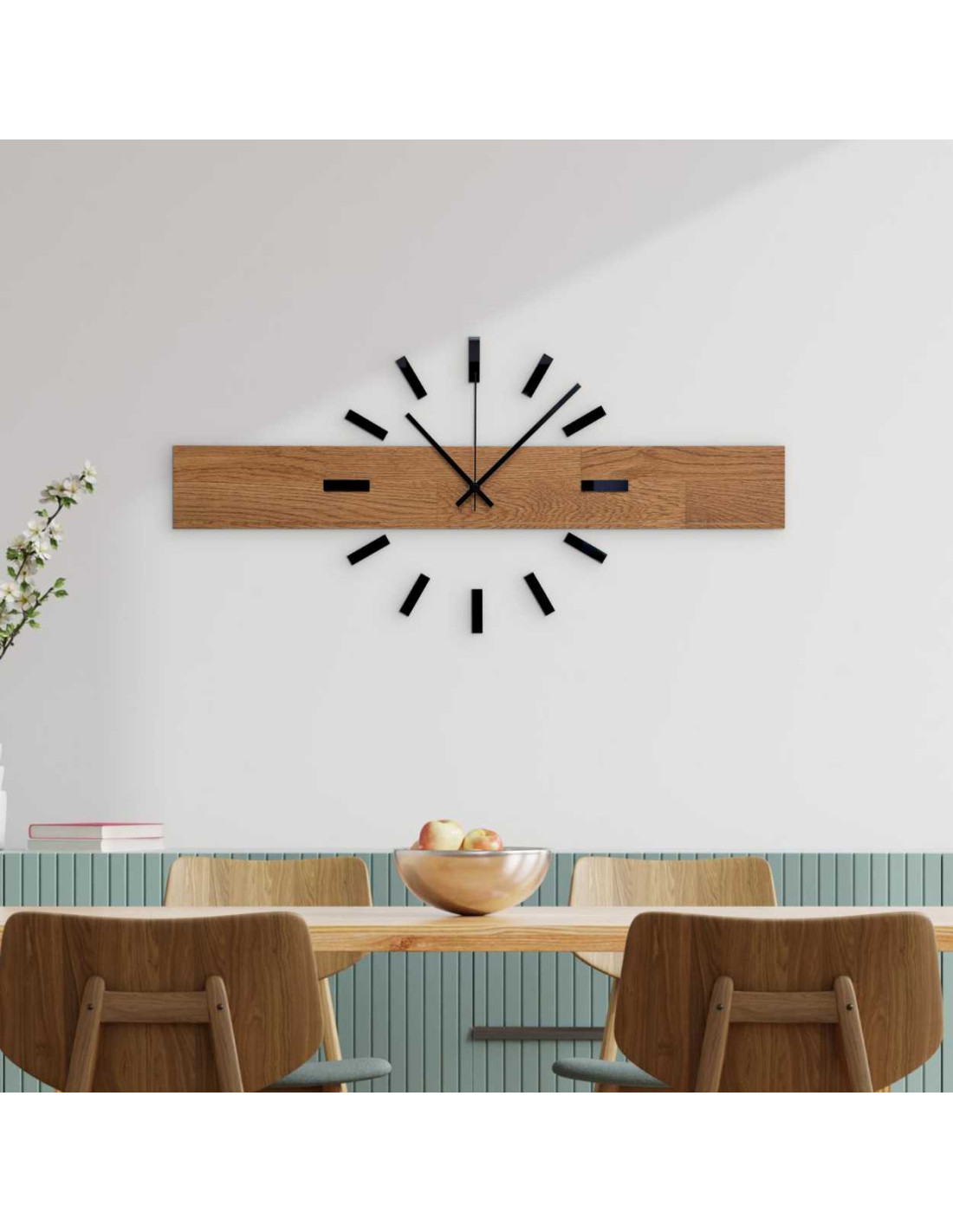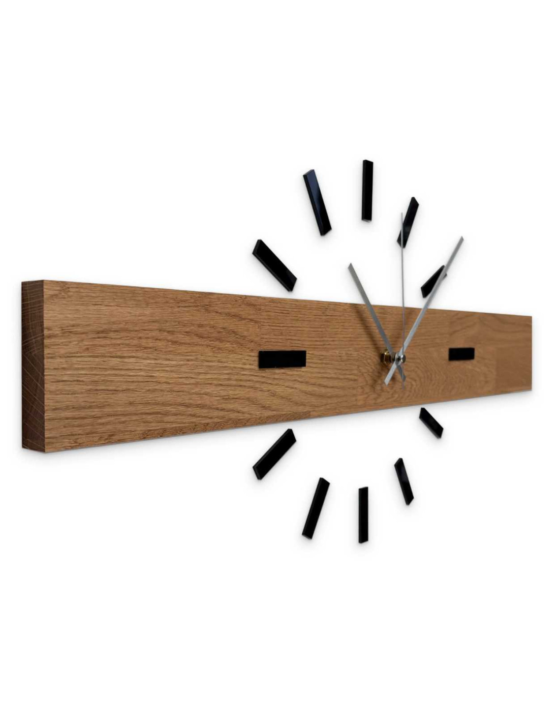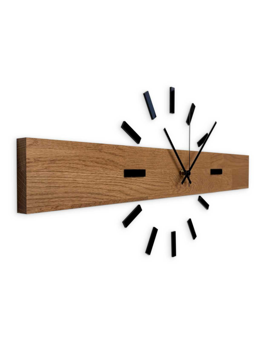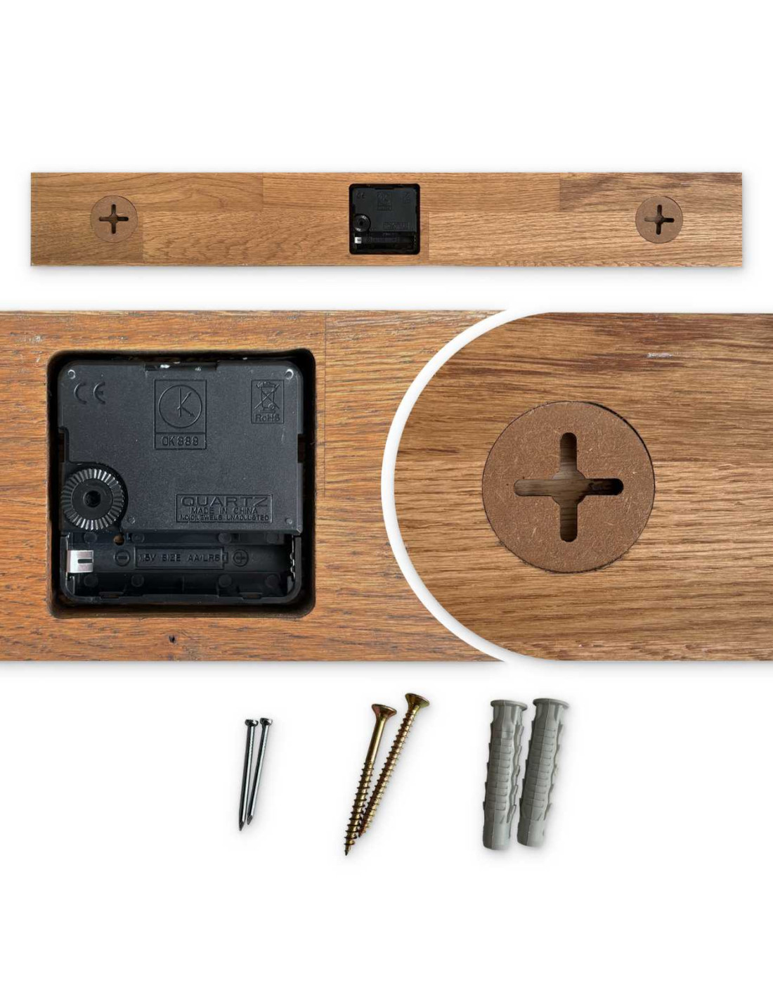 Każdy zegar wykonany jest z litych paneli dębowych, które najpierw są precyzyjnie wycinane przy użyciu technologii CNC, nadając im pożądany kształt i rozmiar.