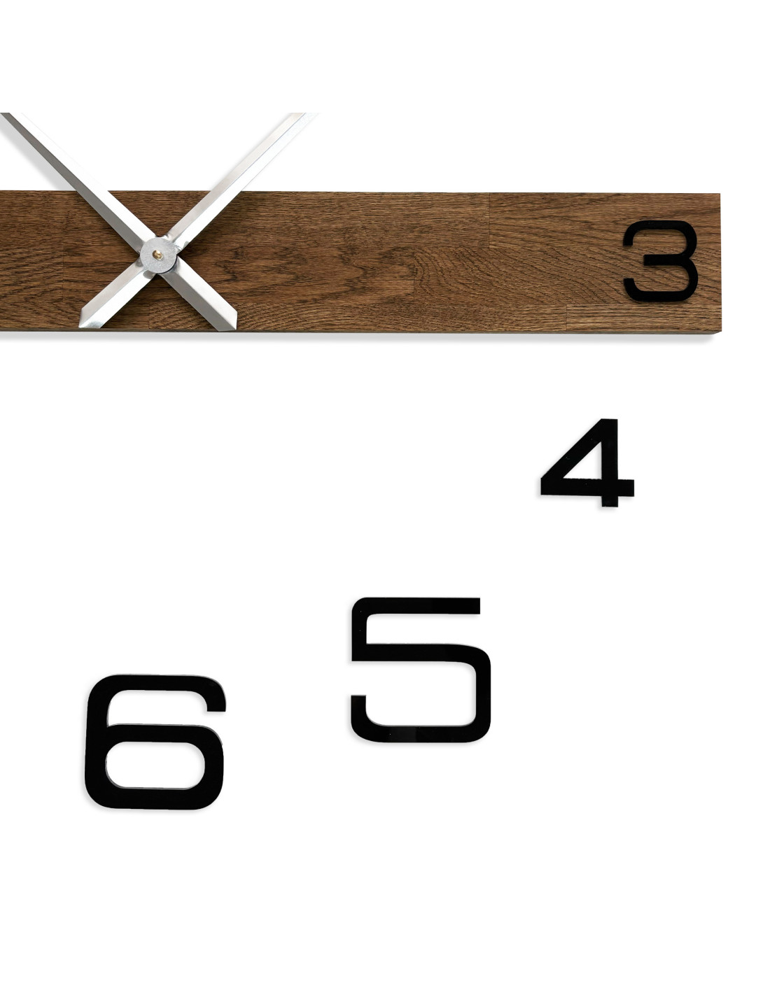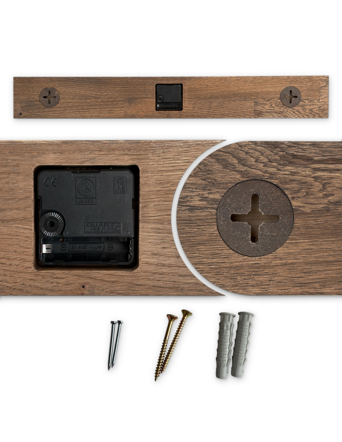 Każdy zegar wykonany jest z litych paneli dębowych , które najpierw są precyzyjnie wycinane przy użyciu technologii CNC, nadając im pożądany kształt i rozmiar.