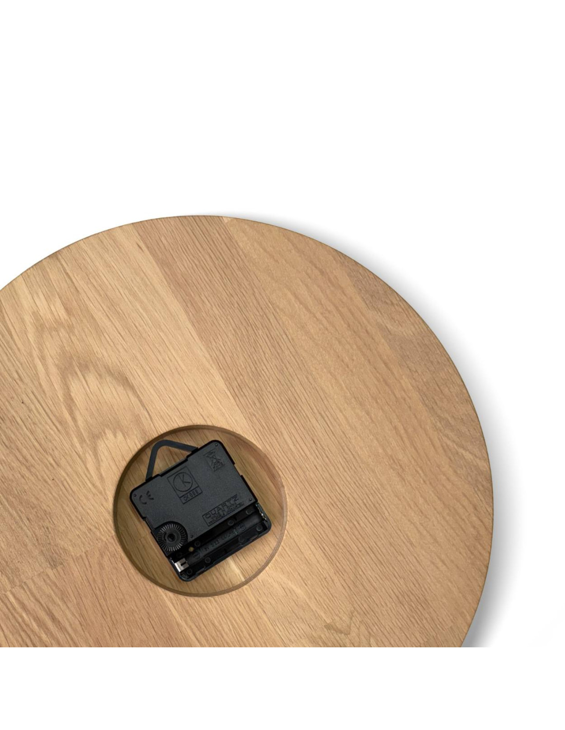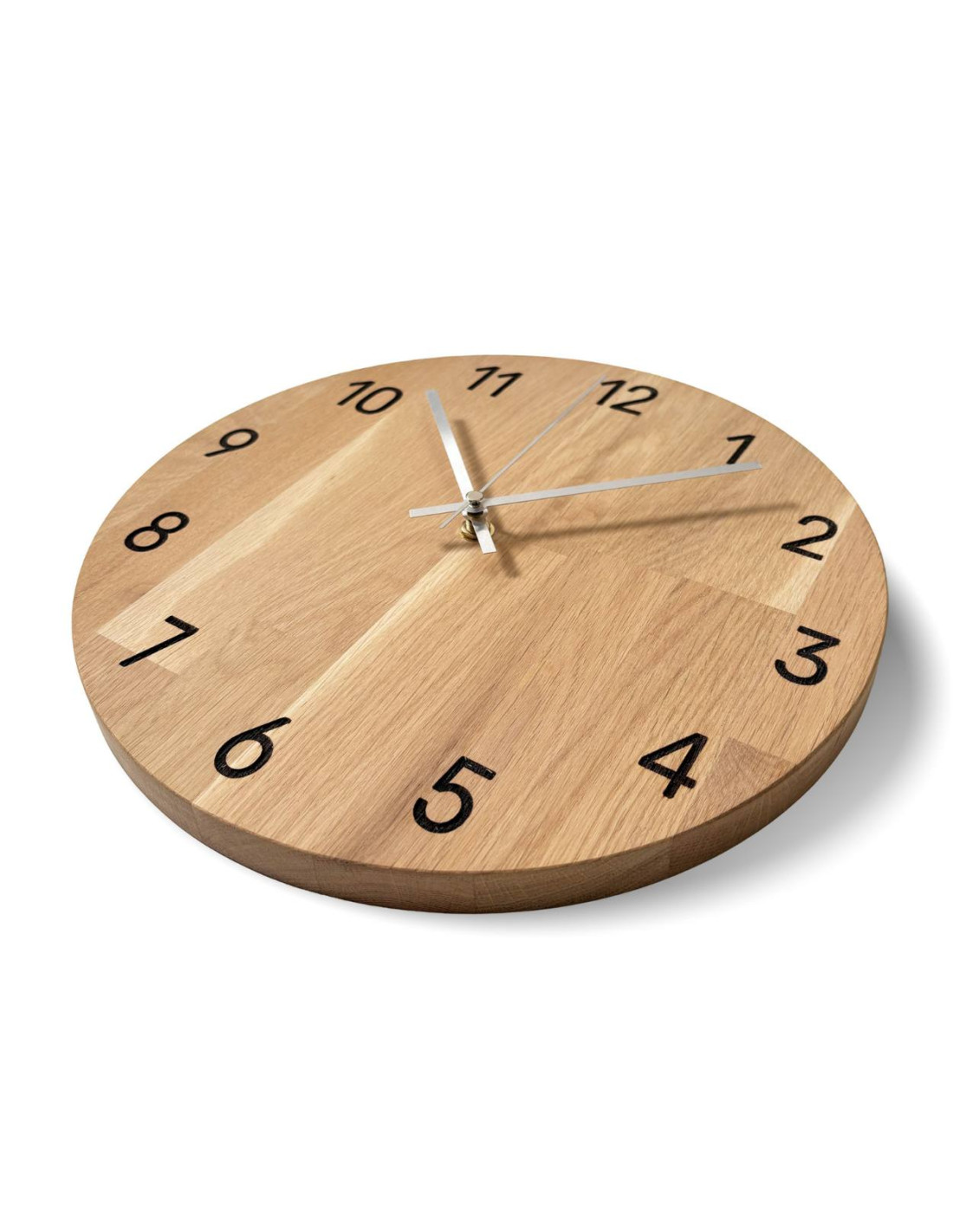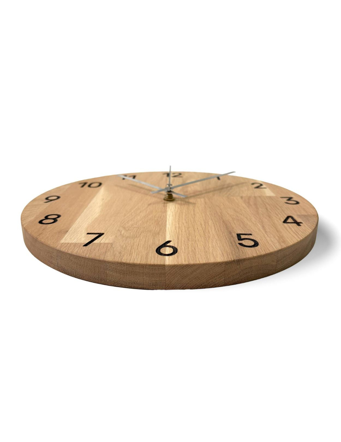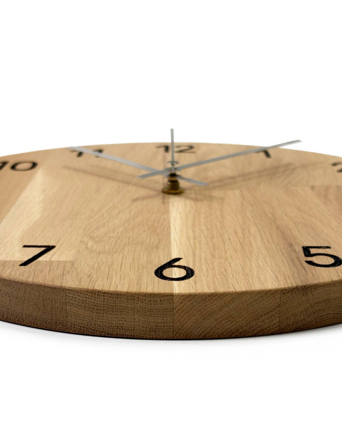 Każdy zegar wykonany jest z litych paneli dębowych, które najpierw są precyzyjnie wycinane przy użyciu technologii CNC, nadając im pożądany kształt i rozmiar.