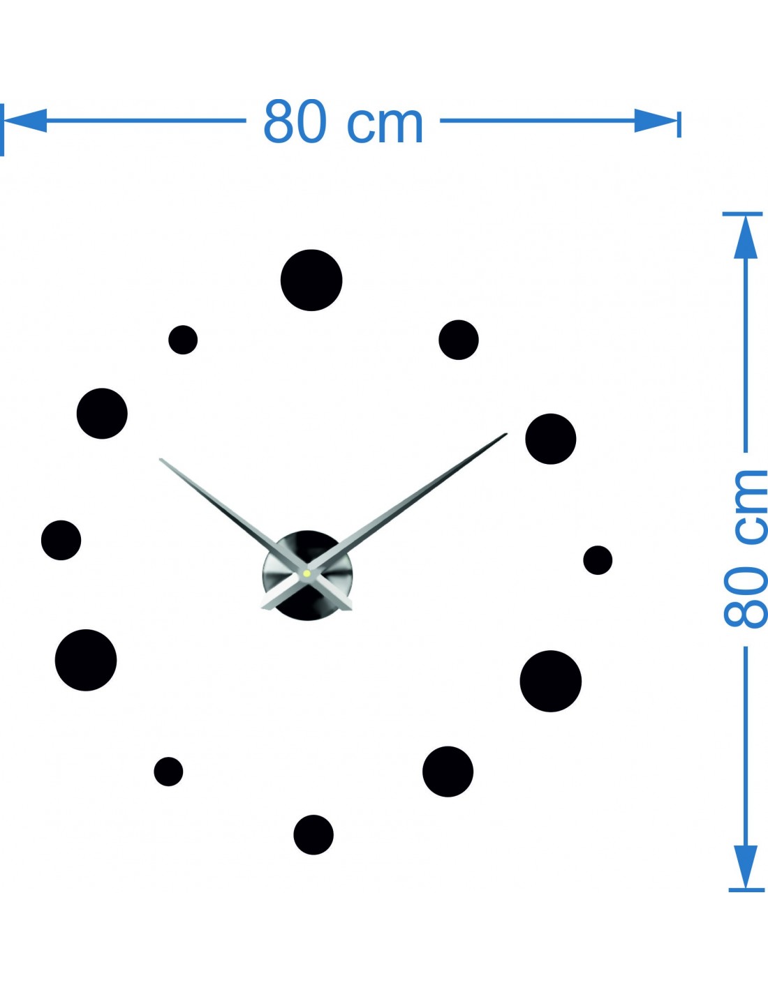 Wymiary naklejki: 800 x 800 mm, można powiększyć do 1300 x 1300 mm. Wymiary mechanizmu zegarowego: 100 x 100 mm. Długość wskazówek: 30 - 40 cm.